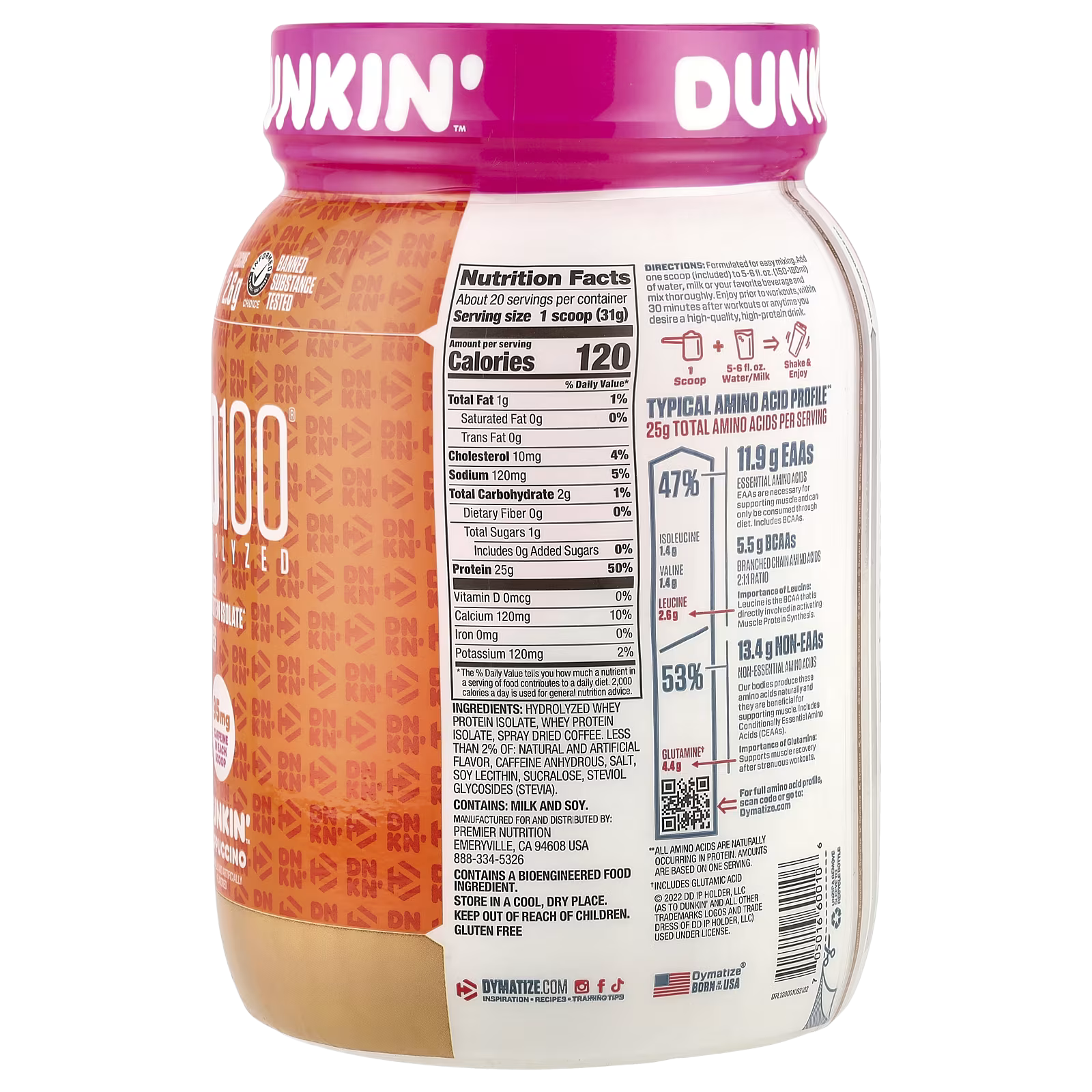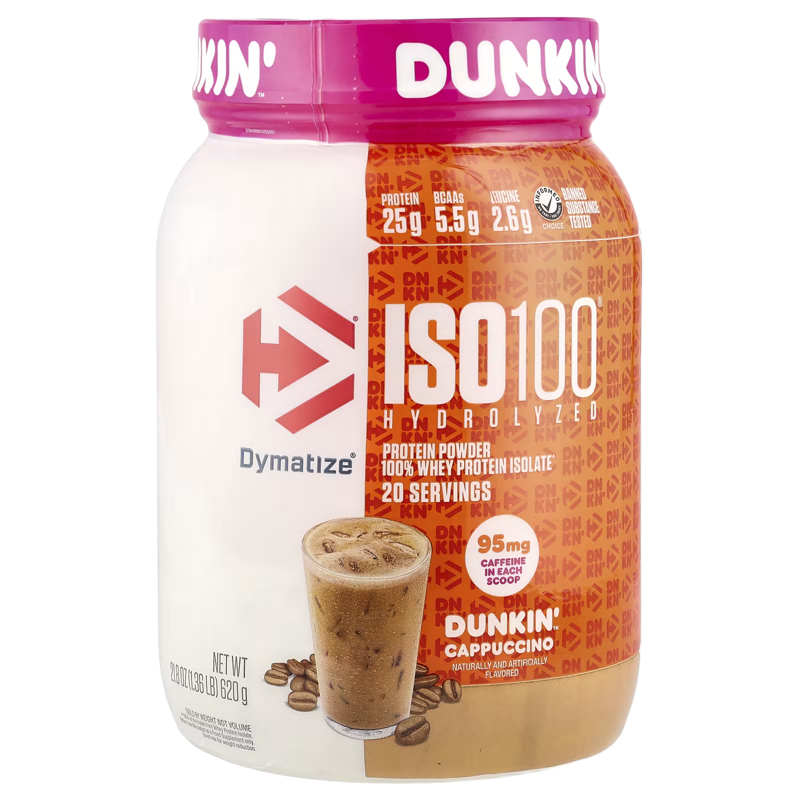 Dymatize, ISO100® Hydrolyzed, 100% Whey Protein Isolate, Dunkin’™ Cappuccino, 21.8 oz (610 g)