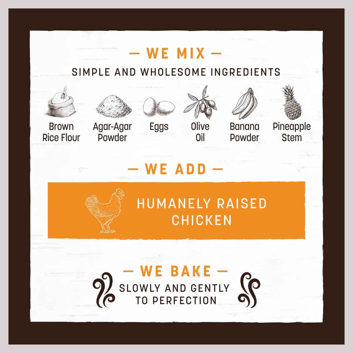 Chicken, Brown Rice Flour, Agar-Agar, Eggs, Olive Oil, Banana Powder, Pineapple Stem.
