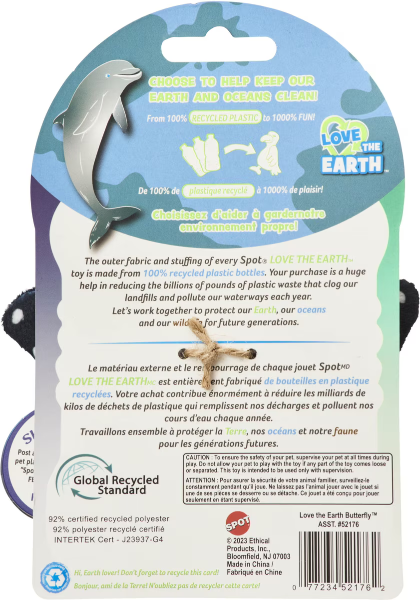 Help protect the planet while providing endless entertainment for your furry friend with Ethical Pet Love The Earth Butterfly Plush Cat Toy. Made from recycled plastic bottles, each toy features a blend of silver vine and catnip to keep your kitty purring with joy. By purchasing this toy, you’re helping to reduce the plastic waste that pollutes landfills and waterways every year. Plus, you’re providing your whiskered wonder with an exciting butterfly plushie that will add excitement to his day.