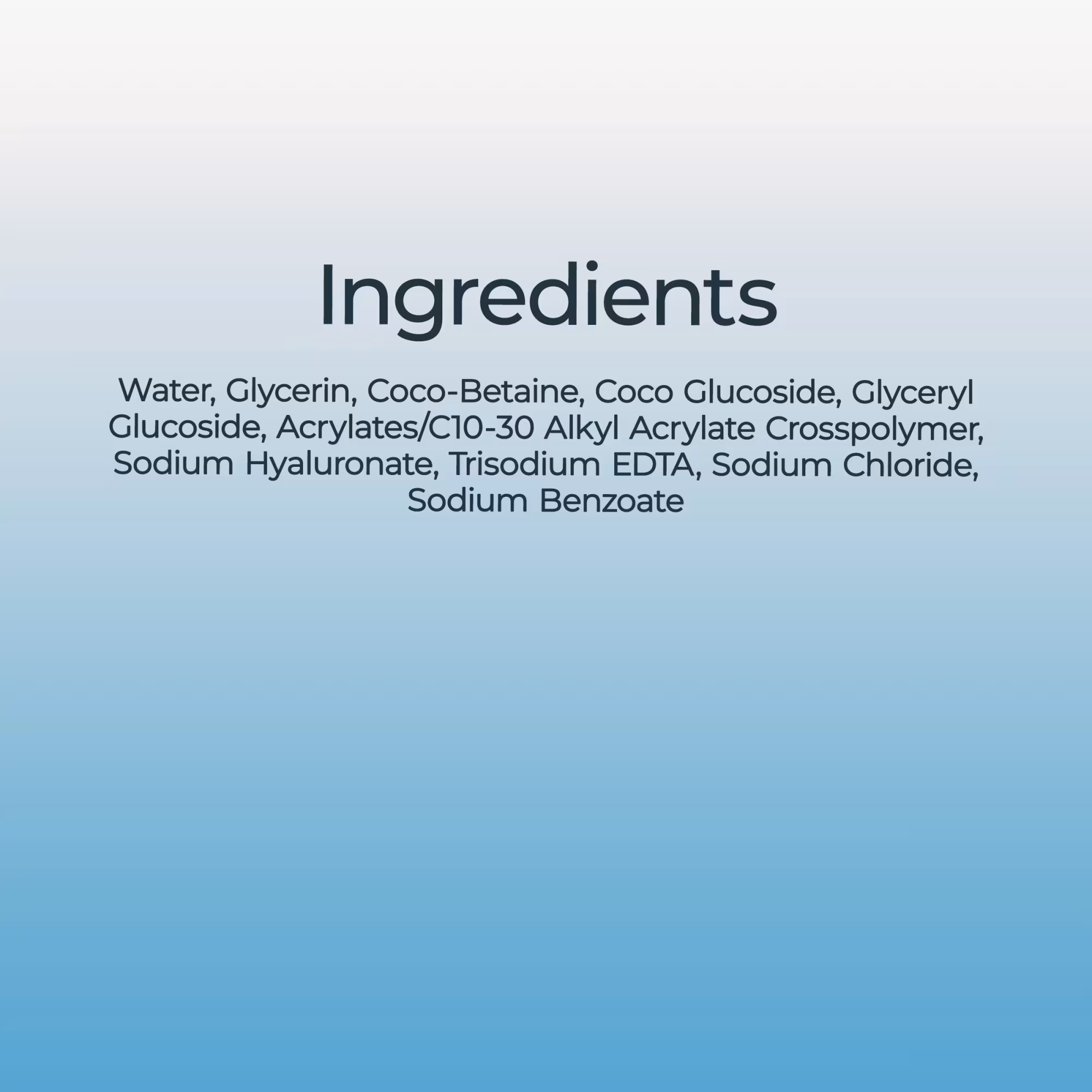 Water, glycerin, coco-betaine, coco glucoside, glyceryl glucoside, acrylates/c10-30 alkyl acrylate crosspolymer, sodium hyaluronate, trisodium edta, sodium chloride, sodium benzoate.