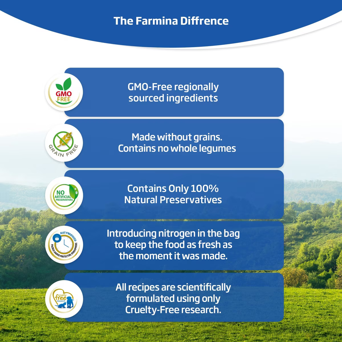 Every Farmina food is made with the best ingredients with the correct amounts of protein, fats, limited carbohydrates and advanced long life vitamins and minerals. The Natural & Delicious Grain-Free formulas are comprised of 70% animal ingredients (pre-cooking weight) and 30% vegetables, fruits, vitamins and minerals. These diets are also quite different from competing foods because they use better quality protein sources that are devoid of bone, so ash is as low as 7.80% and calcium and phosphorous levels are controlled.