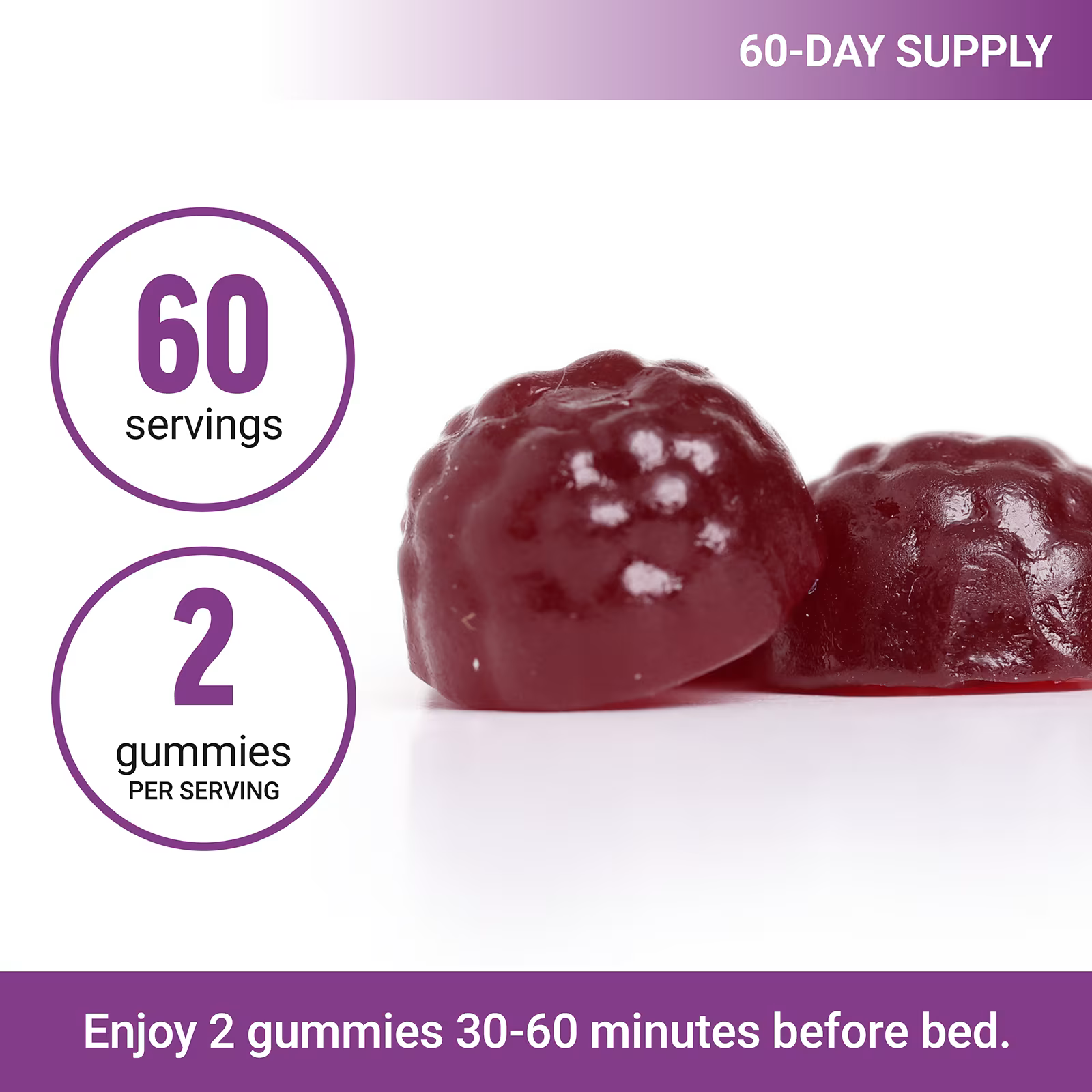 Enjoy 2 gummies 30-60 minutes before bed.