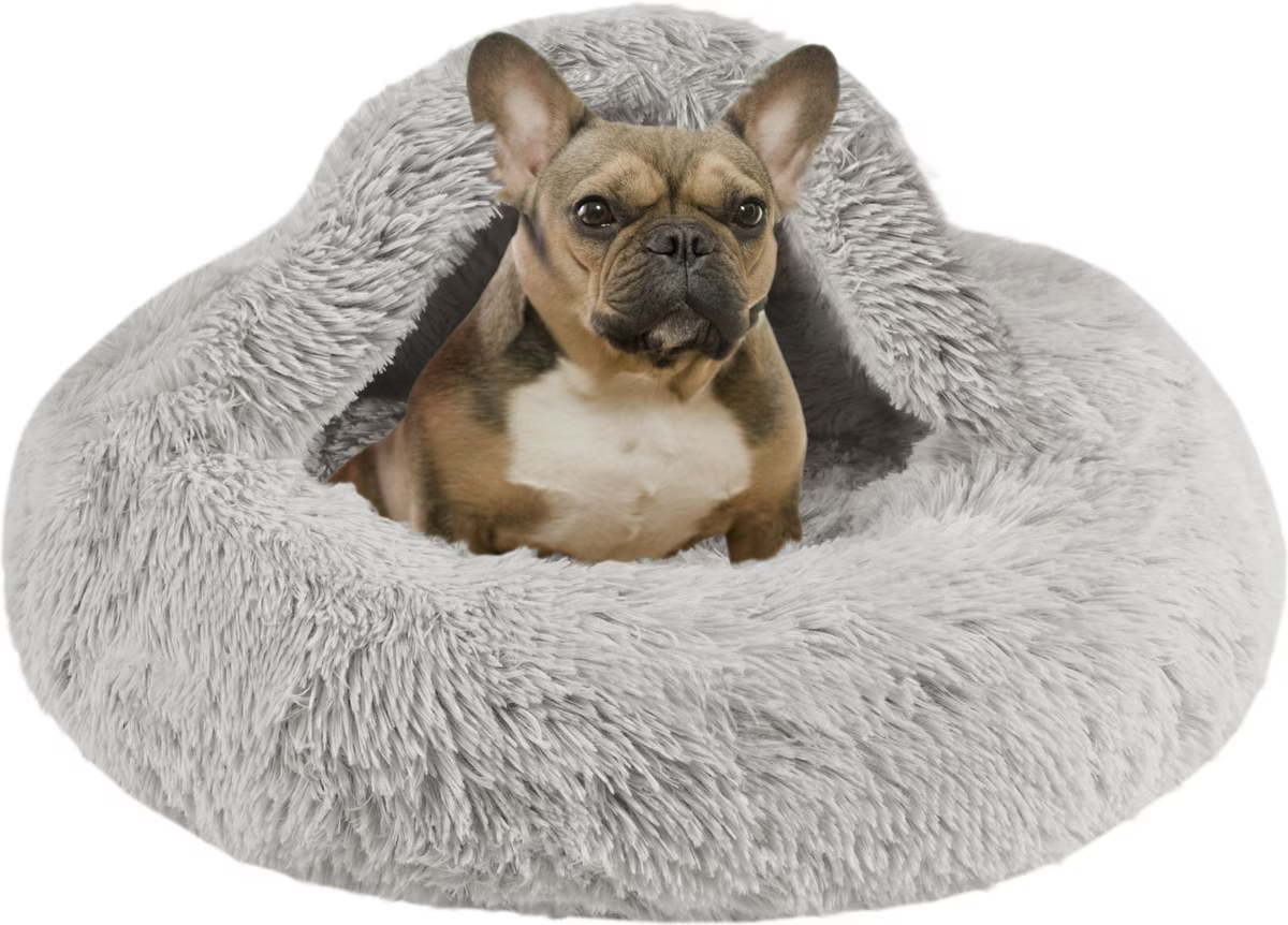 Friends Forever Luna Donut Faux Fur Cozy Cave Covered Dog Bed with Hooded Blanket, Grey