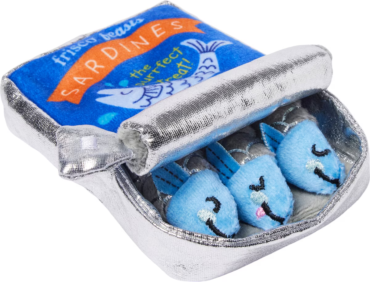 This plush cat toy looks like a can of sardines with its lid peeled away to reveal three sardines inside for a hide-and-seek style way to play.