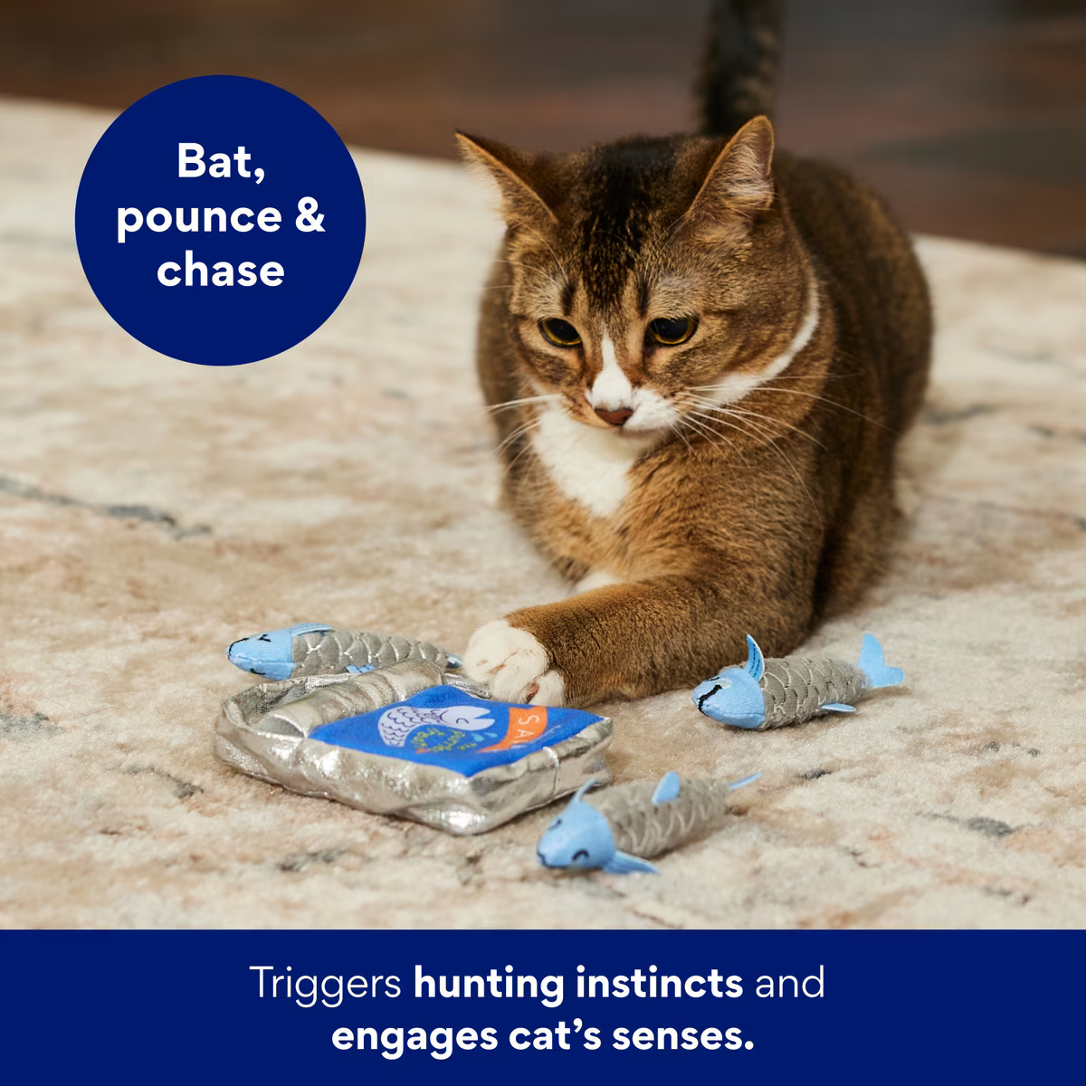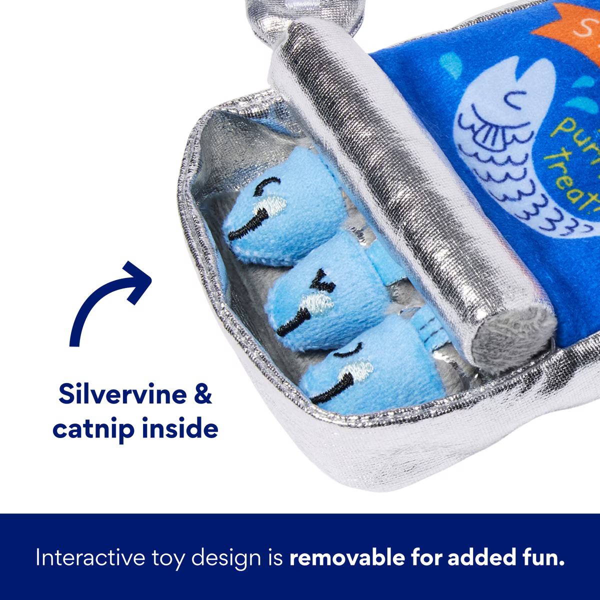 Each sardine and the plush “can” boast a blend of silvervine and catnip inside to ensure your cat’s interest is piqued to seek out the sardines.