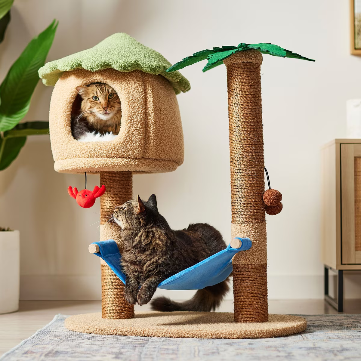Bring the groovy island vibes home with this tiki hut cat tree from Frisco by Chewy. The design combines the appeal of a cat condo and scratcher to provide several ways for your kitty to unwind and play. There’s a plush hammock for stretching and hanging out, a private hideaway with a soft, reversible pillow inside, a perch at the top, and two dangling toys tethered by elastic. The easy-to-assemble design screws together without any tools necessary and features sisal-wrapped tree trunks to satisfy your cat’s scratching impulses. Plus, the hideaway can be removed if they want to enjoy some privacy elsewhere, and the pillow is machine washable so it’s easy to keep clean.