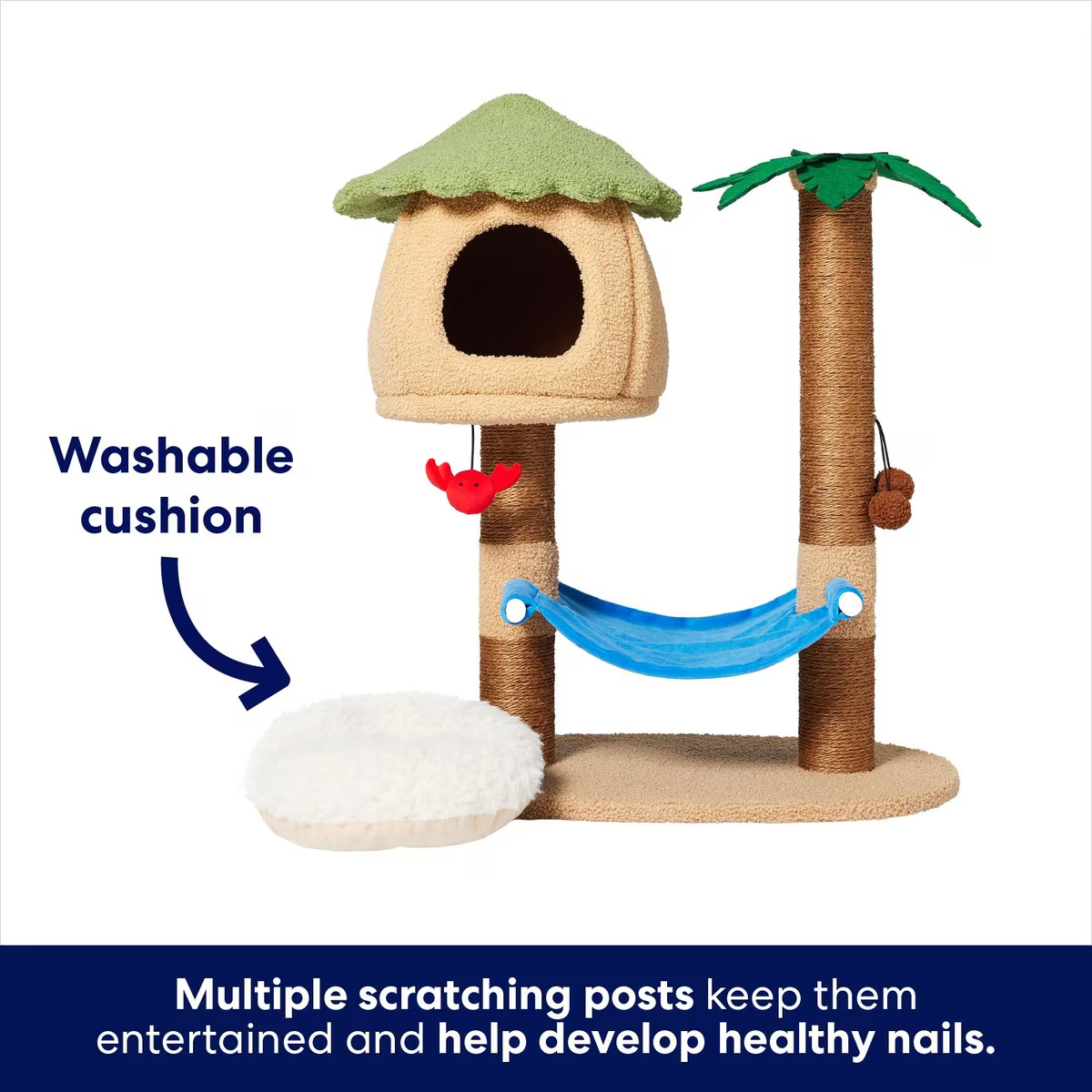 Three dangling toys including a pair of coconuts and a crab are tethered to the tiki hut and the coconut post for some tropical playtime fun.