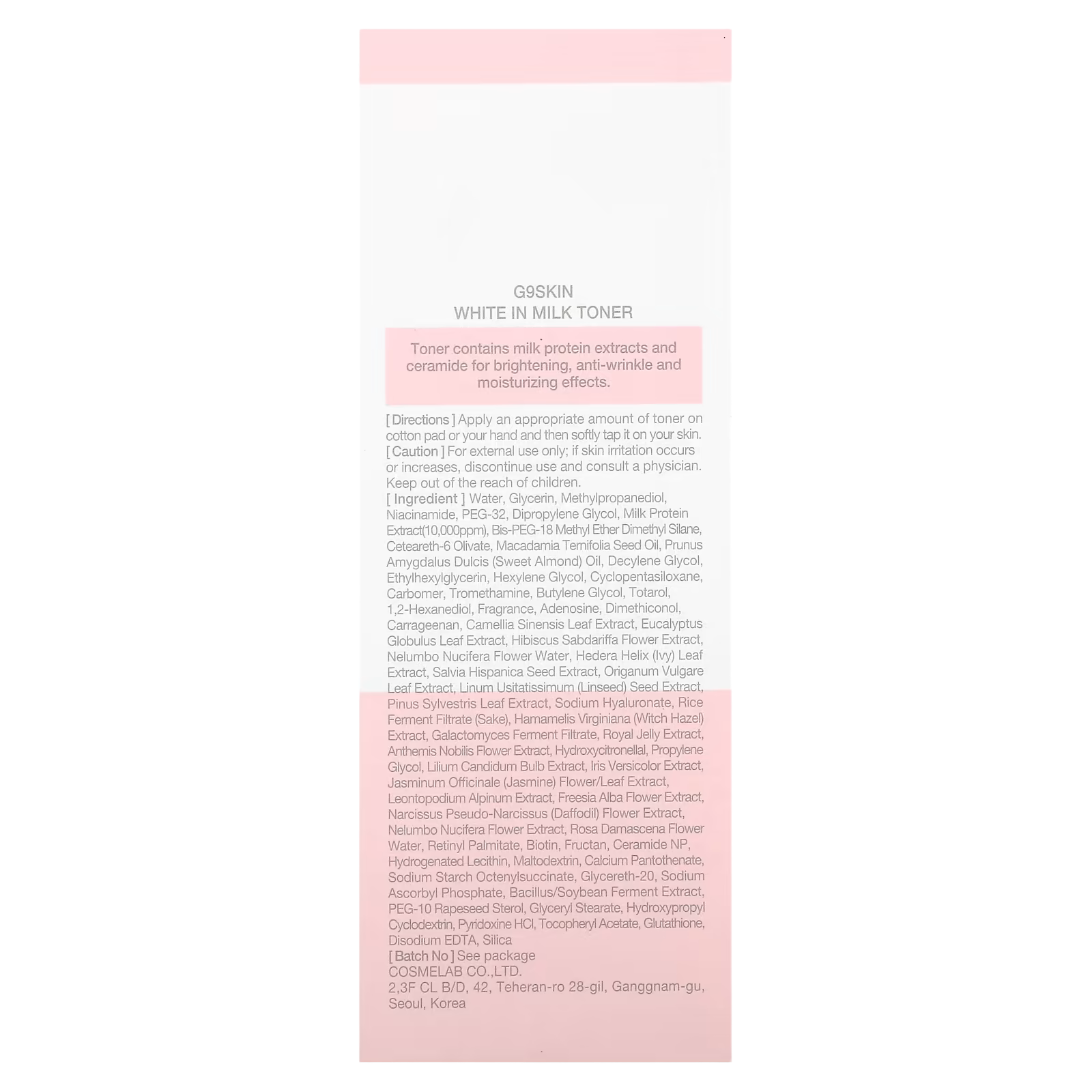 Toner contains milk protein extracts and ceramide for brightening, anti-wrinkle and moisturizing effects.