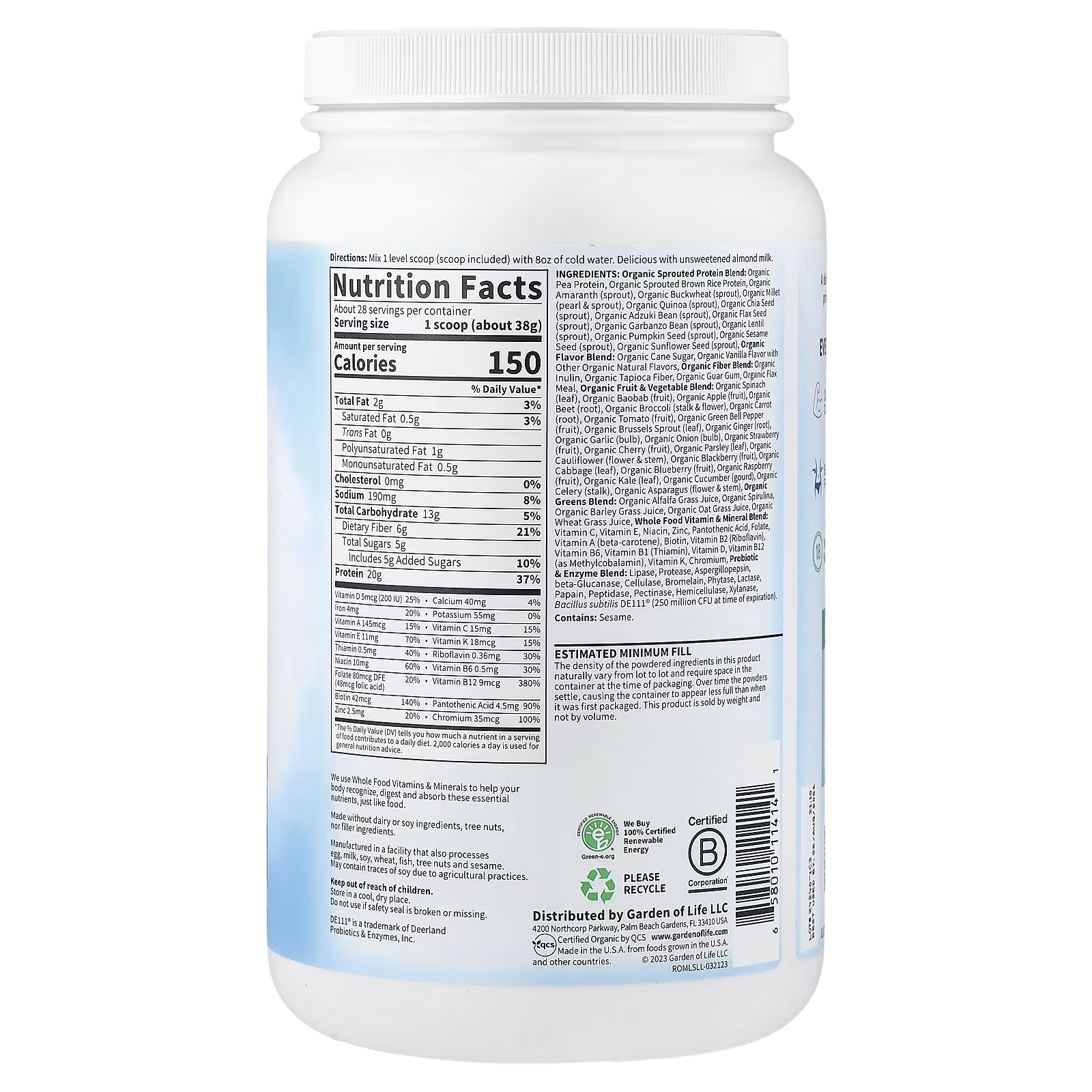 Organic sprouted protein blend: organic pea protein, organic sprouted brown rice protein, organic amaranth (sprout), organic buckwheat (sprout), organic millet (pearl & sprout), organic quinoa (sprout), organic chia seed (sprout), organic adzuki bean (sprout), organic flax seed (sprout), organic garbanzo bean (sprout), organic lentil (sprout), organic pumpkin seed (sprout), organic sesame seed (sprout), organic sunflower seed (sprout), organic flavor blend: organic cane sugar, organic vanilla flavor with other organic natural flavors, organic fiber blend: organic inulin, organic tapioca fiber, organic guar gum, organic flax meal, organic fruit & vegetable blend: organic spinach (leaf), organic baobab (fruit), organic apple (fruit), organic beet (root), organic broccoli (stalk & flower), organic carrot (root), organic tomato (fruit), organic green bell pepper (fruit), organic brussels sprout (leaf), organic ginger (root), organic garlic (bulb), organic onion (bulb), organic strawberry (fruit), organic cherry (fruit), organic parsley (leaf), organic cauliflower (flower & stem), organic blackberry (fruit), organic cabbage (leaf), organic blueberry (fruit), organic raspberry (fruit), organic kale (leaf), organic cucumber (gourd), organic celery (stalk), organic asparagus (flower & stem), organic greens blend: organic alfalfa grass juice, organic spirulina, organic barley grass juice, organic oat grass juice, organic wheat grass juice, whole food vitamin & mineral blend: vitamin c, vitamin e, niacin, zinc, pantothenic acid, folate, vitamin a (beta-carotene), biotin, vitamin b2 (riboflavin), vitamin b6, vitamin b1 (thiamin), vitamin d, vitamin b12 (as methylcobalamin), vitamin k, chromium, probiotic & enzyme blend: lipase, protease, aspergillopepsin, beta-glucanase, cellulase, bromelain, phytase, lactase, papain, peptidase, pectinase, hemicellulase, xylanase, bacillus subtilis de111® (250 million cfu at time of expiration).