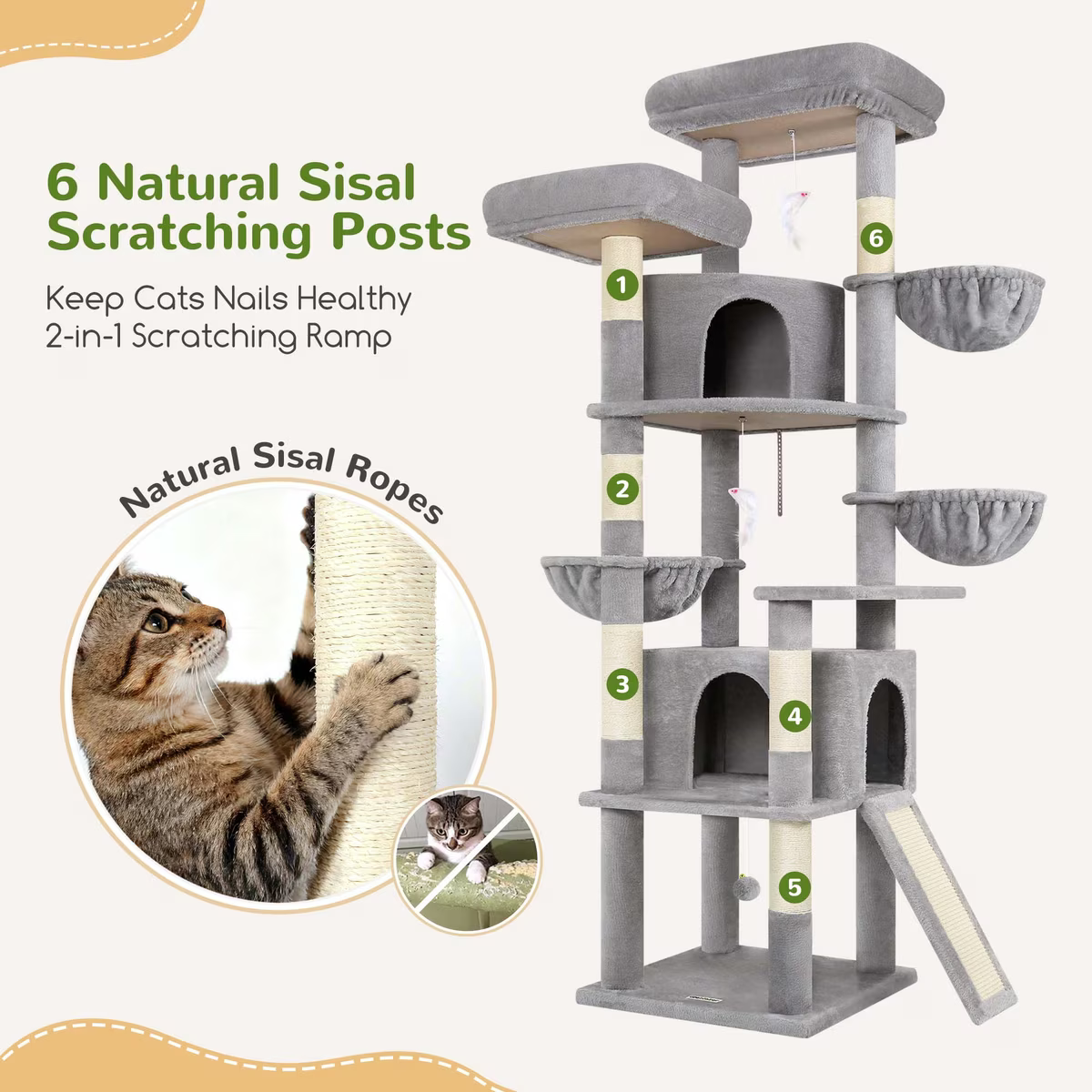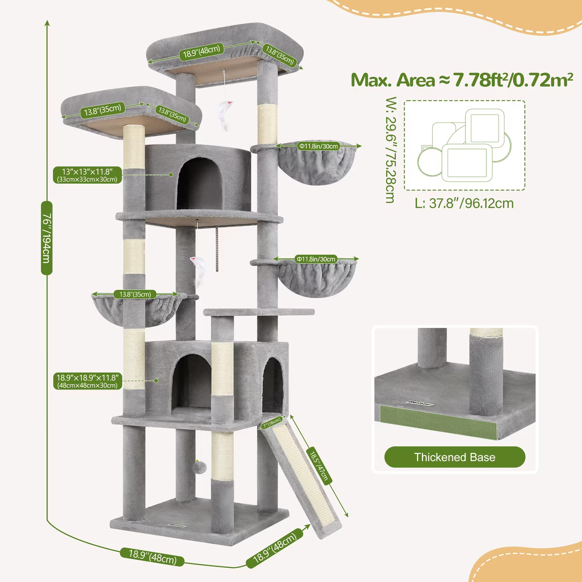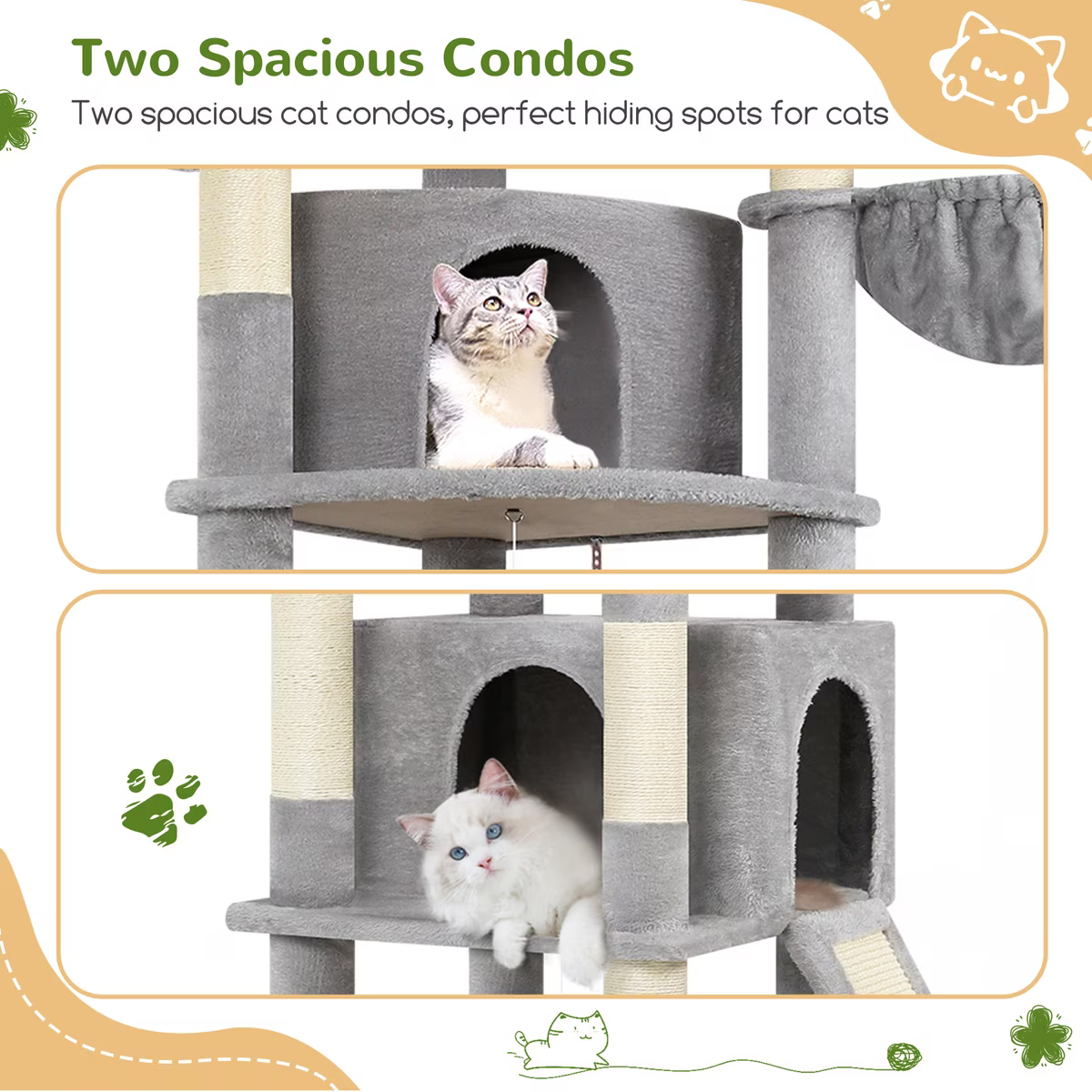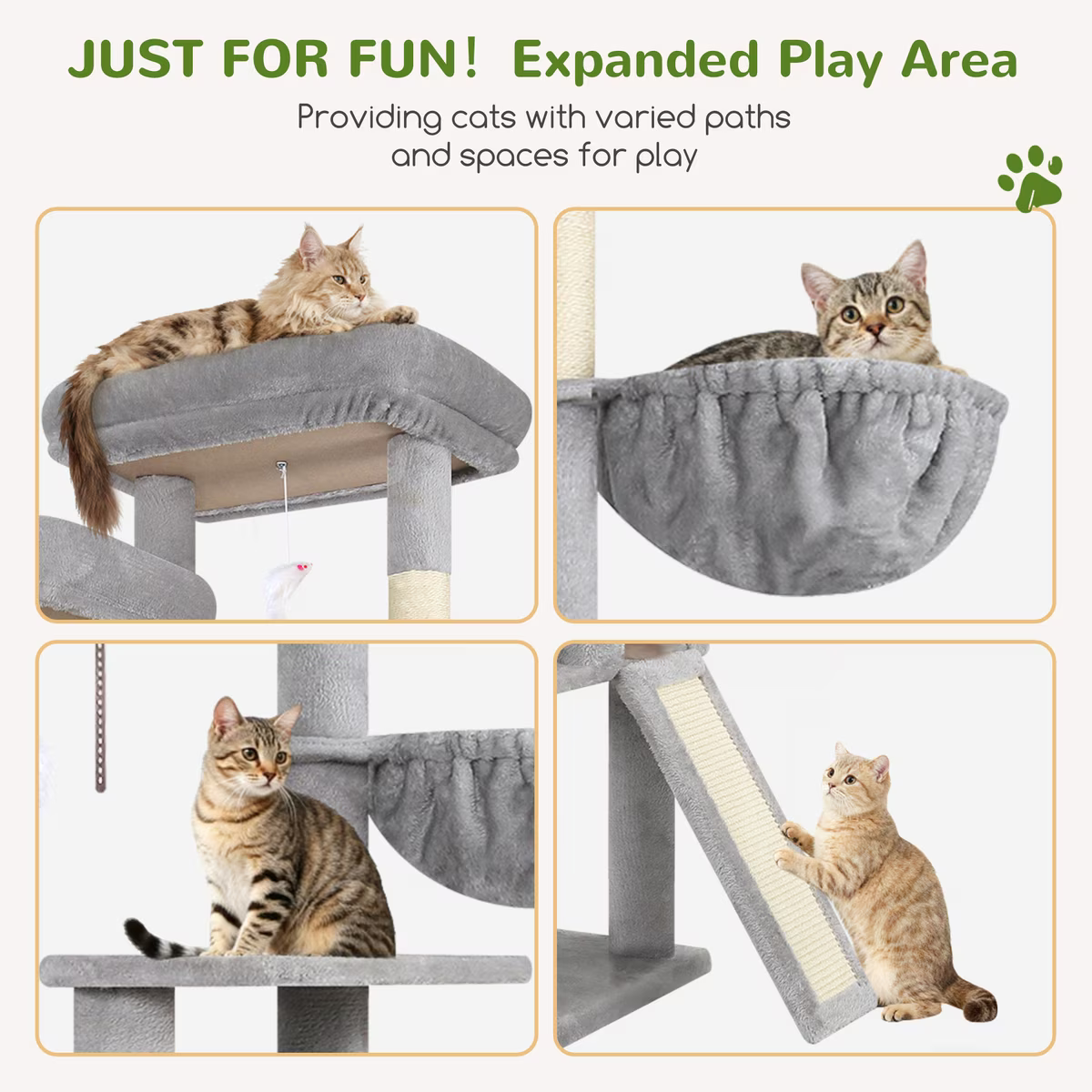 Encourages climbing, jumping, and playing with multiple platforms, hanging baskets, and cat houses, helping your furbabies stay active and healthy.