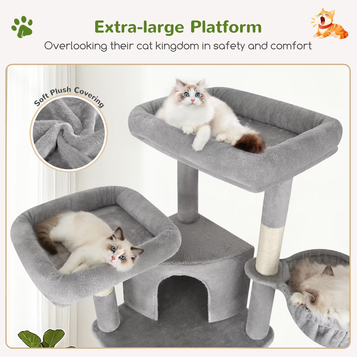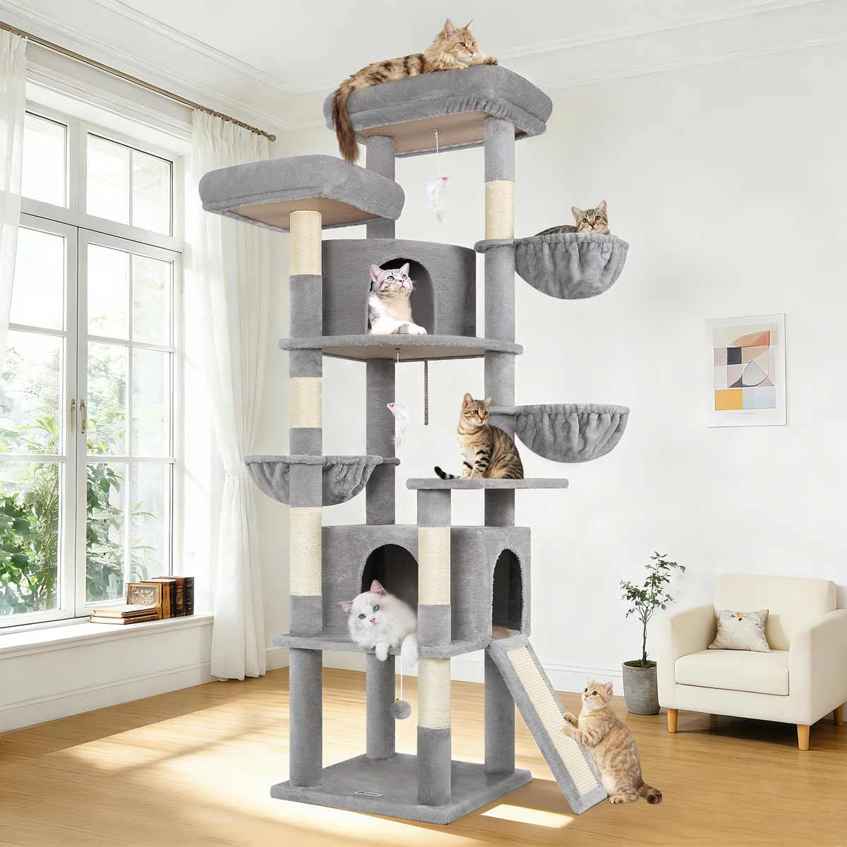Multiple platforms and cozy houses provide ample space for multiple cats to play and relax comfortably.
