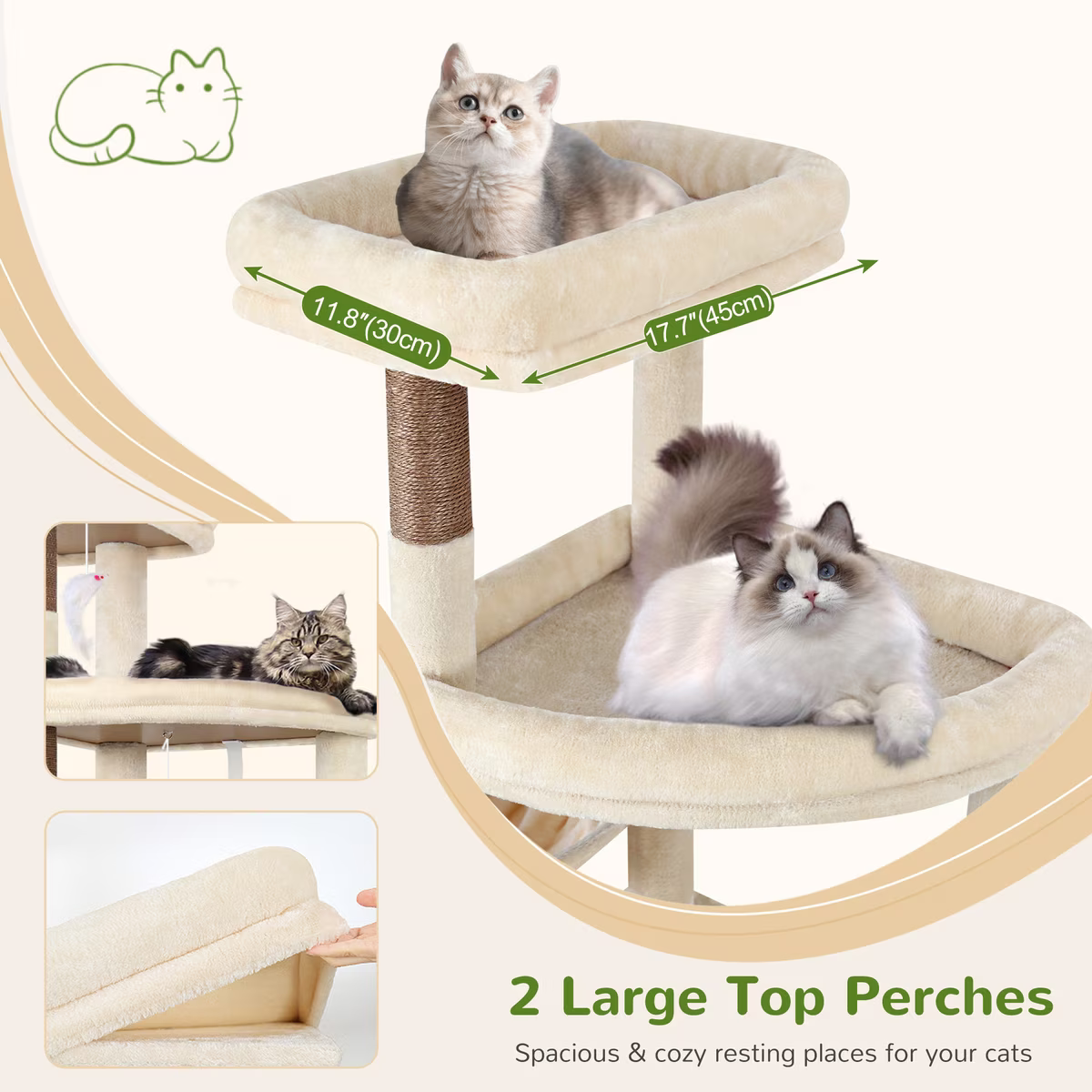 Multiple jumping platforms and a cushioned top perch for safe observation and leisure.
