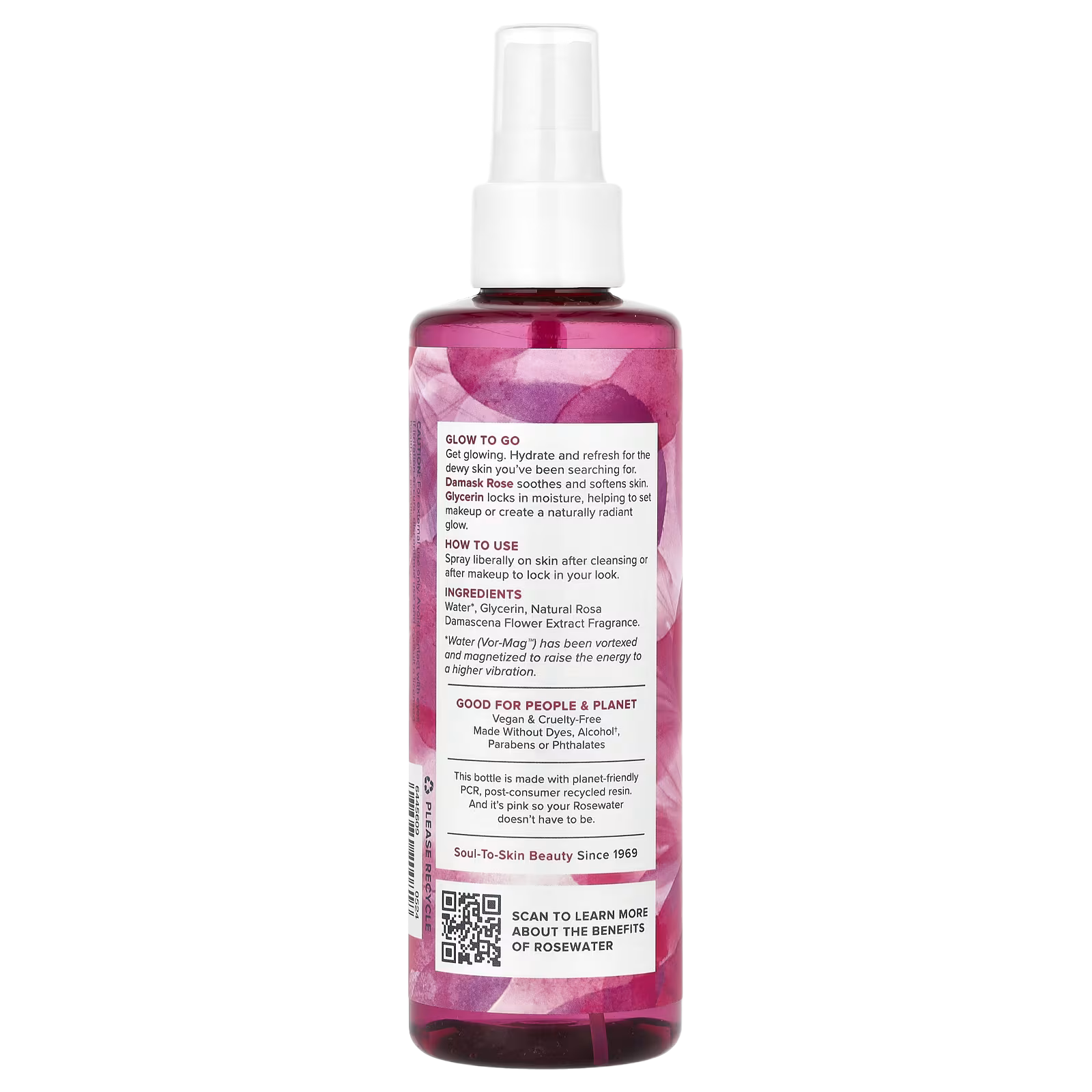 Get glowing. Hydrate and refresh for the dewy skin you’ve been searching for. Damask Rose soothes and softens skin. Glycerin locks in moisture, helping to set makeup or create a naturally radiant glow.