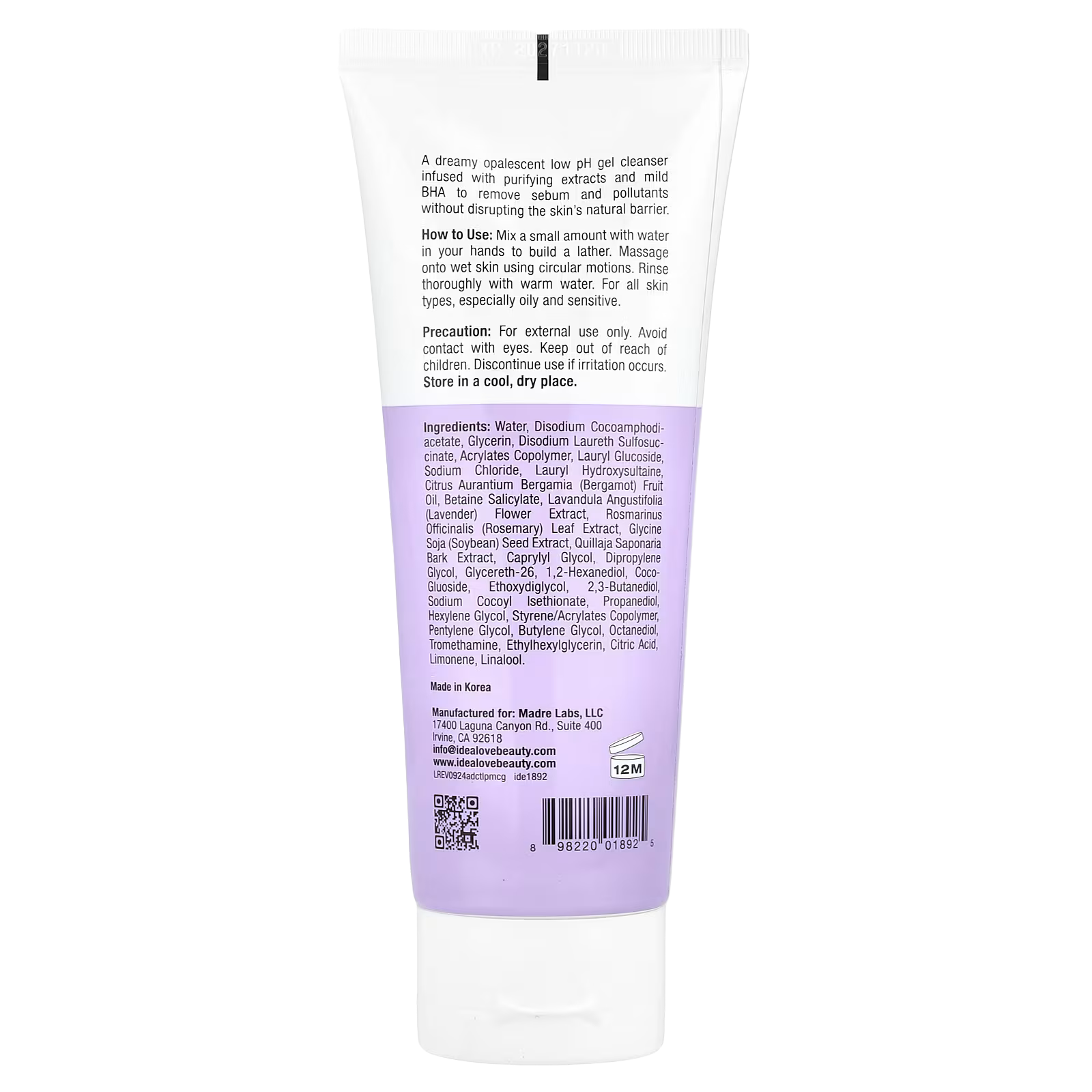 Slightly Acidic (pH: 5.5-5.9) cleansers with a low pH can help support the skin’s natural balance. Many cleansers try to combat oiliness by being more alkaline (ph 7+) which strips the skin causing it to dry out and compromises the natural skin barrier. This Idealove formula cleanses away oil and debris while restoring the skin back to its optimal pH level where it is balanced and more resistant to bacteria.