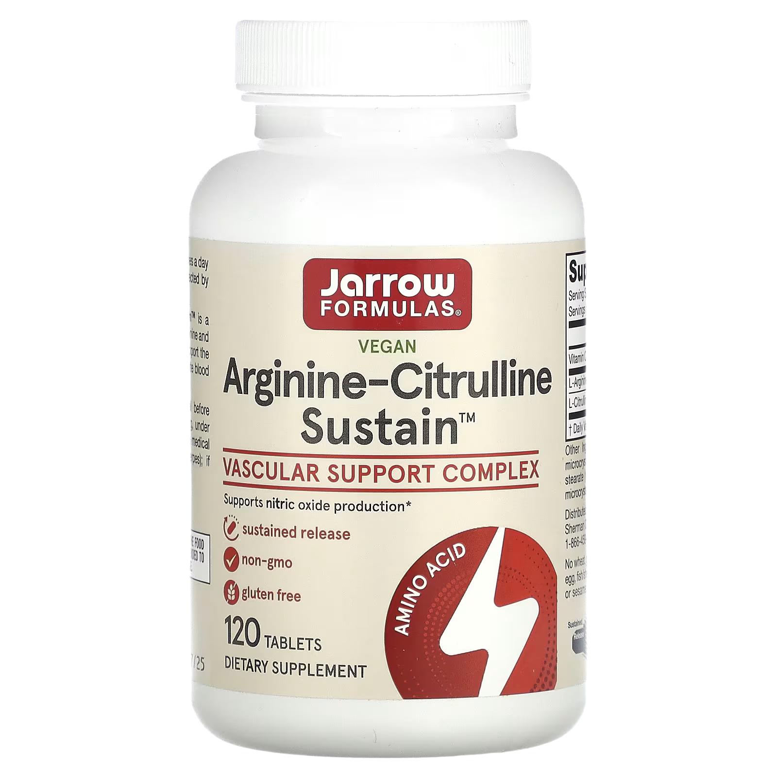 Jarrow Formulas® Arginine-Citrulline Sustain™ is a synergistic combination of sustained-release arginine and citrulline in equal amounts plus vitamin C to support the vascular production of nitric oxide (NO), promote blood flow, and support cardiovascular health.