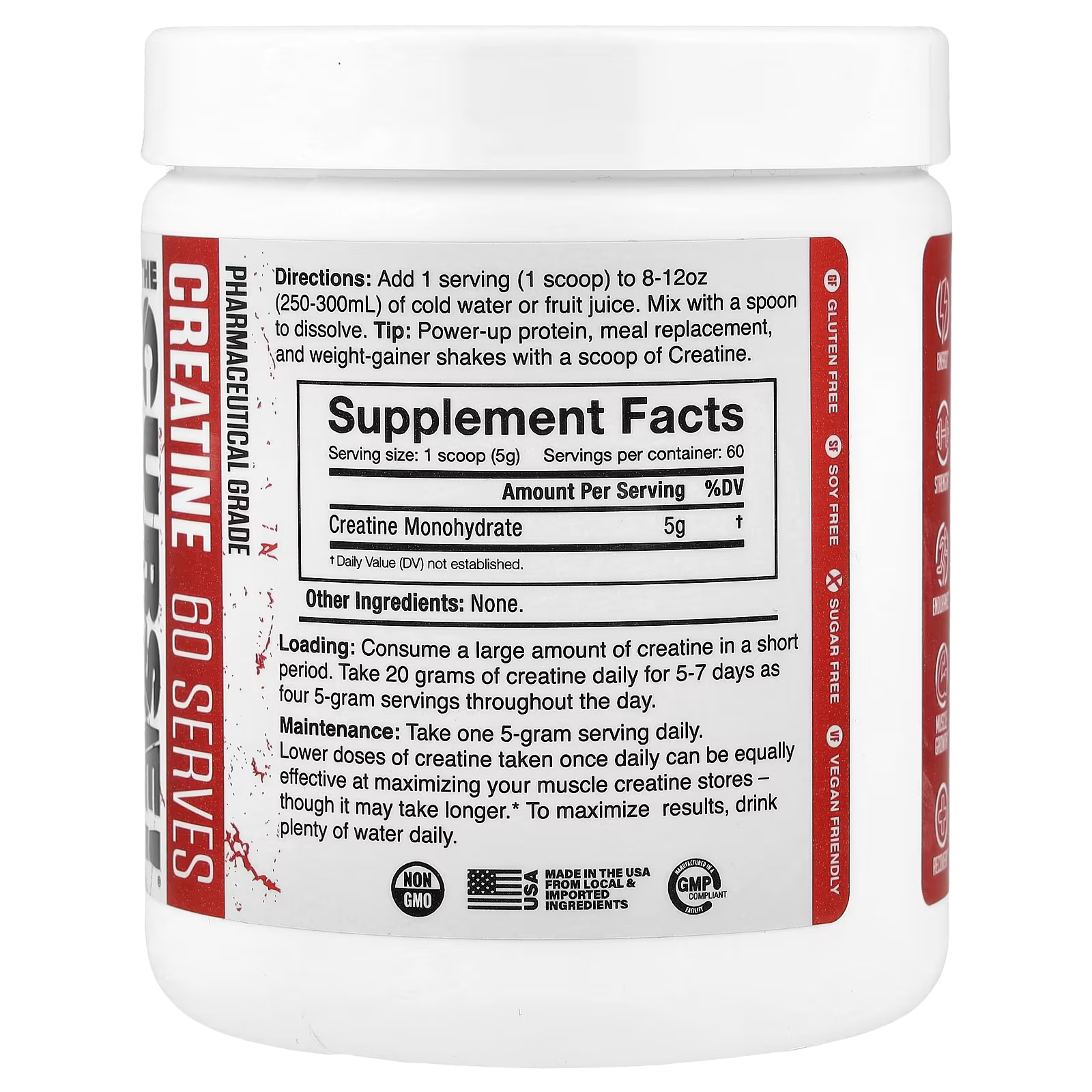 Loading: Consume a large amount of creatine in a short period. Take 20 grams of creatine daily for 5-7 days as four 5-gram servings throughout the day.
