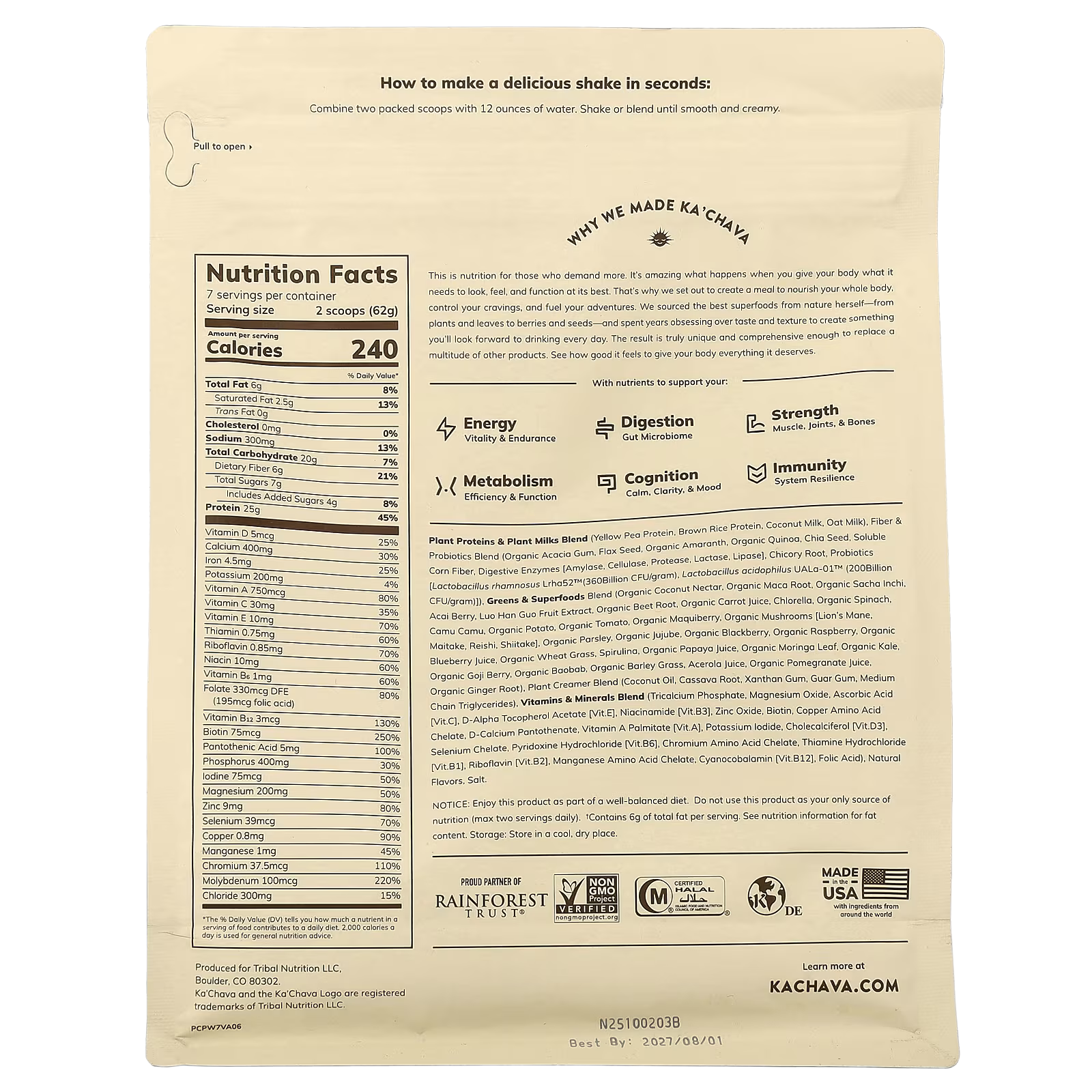 Plant proteins & plant milks blend (yellow peg protein, brown rice protein, coconut milk, oat milk), fiber & probiotics blend (organic acacia gum, flax seed, organic amaranth, organic quinoa, chia seed, soluble corn fiber, digestive enzymes [amylase, cellulose, protease, lactase, lipase), chicory root, probiotics (lactobacillus rhamnosus lrha52™ (360billion cfu/gram), lactobacillus acidophilus ual-01™ (200billion cfu/gram]), greens & superfoods blend (organic coconut nectar, organic maca root, organic sacha inchi acai berry, luo han guo fruit extract, organic beet root, organic carrot juice, chlorella, organic spinach, camu camu, organic potato, organic tomato, organic maquiberry, organic mushrooms [lion’s mane. maitake, reishi, shitake), organic parsley, organic jujube, organic blackberry, organic raspberry, organic blueberry juice, organic wheat gross, spirulina, organic papaya juice, organic moringa leaf, organic kale, organic goji berry, organic baobab, organic barley grass, acerola juice, organic pomegranate juice, organic ginger root), plant creamer blend (coconut oil, cassava root, xanthan gum, guar gum, medium chain triglycerides), vitamins & minerals blend (tricalcium phosphate, magnesium oxide, ascorbic acid [vit.c], d-alpha tocopherol acetate (vit.e), niacinamide (vit.83), zinc oxide, biotin, copper amino acid chelate, d-calcium pantothenate, vitamin a palmitate (vit a), potassium iodide, cholecalciferol (vit.d3), selenium chelate, pyridoxine hydrochloride [vit.b6), chromium amino acid chelate, thiamine hydrochloride (vit.81), riboflavin (vit.b2), manganese amino acid chelate, cyanocobalamin (vit b12), folic acid), natural flavors, salt.