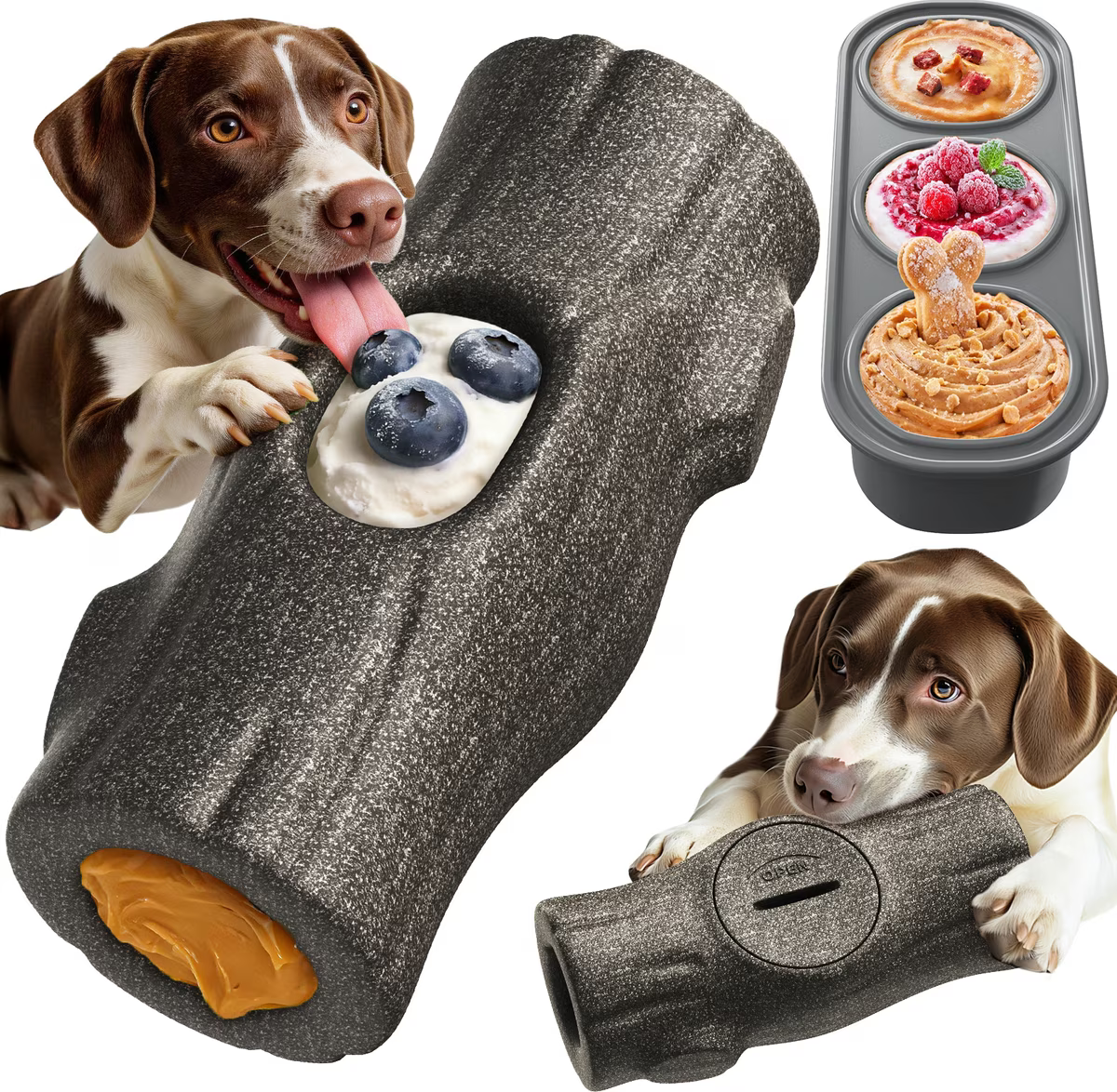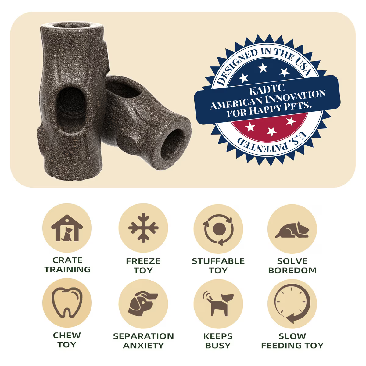 Designed in the USA, this toy combines a frozen food filling toy with a chew toy, providing hours of entertainment.