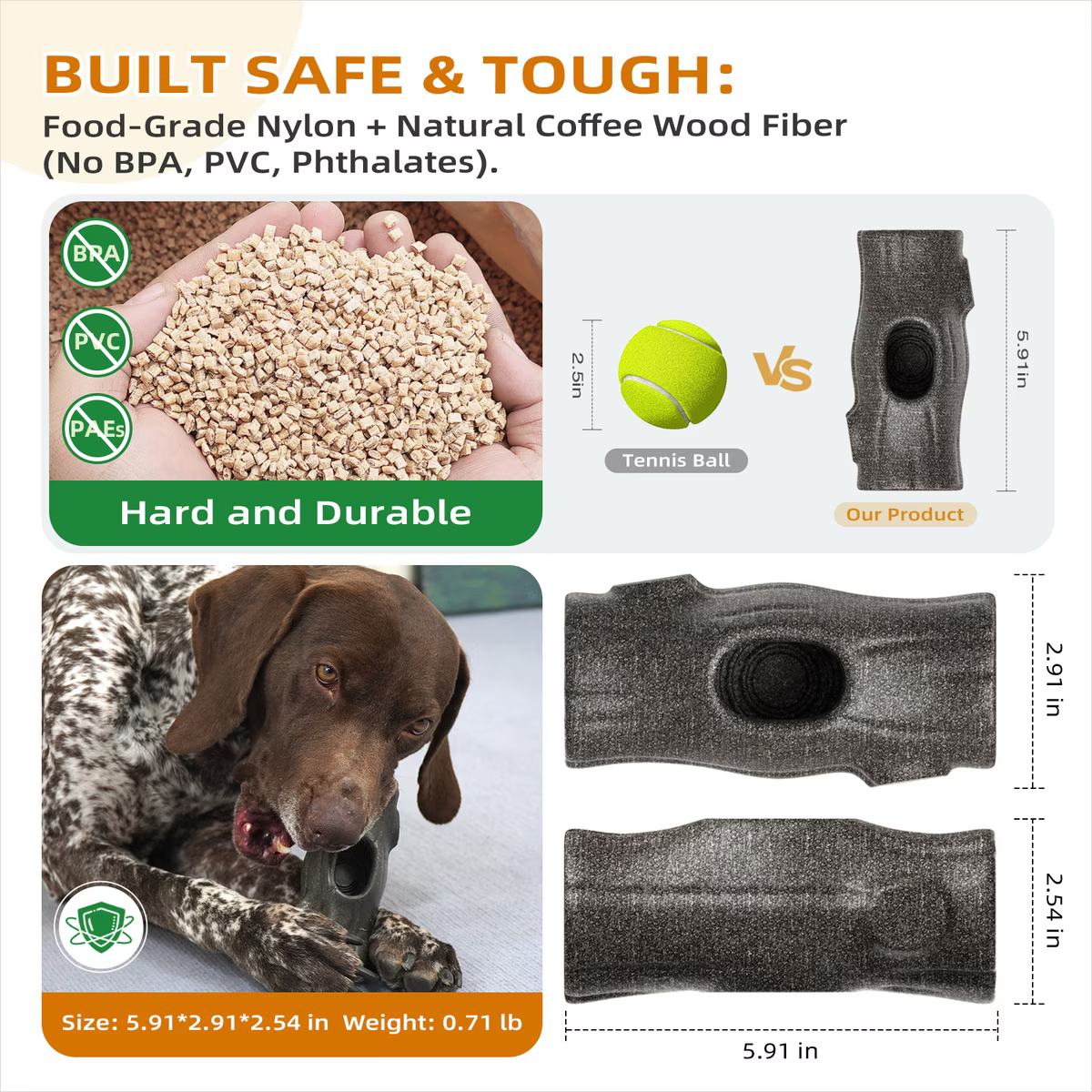 Made from food-grade nylon and reinforced with natural coffee wood fiber, it’s safe and durable for heavy chewers.