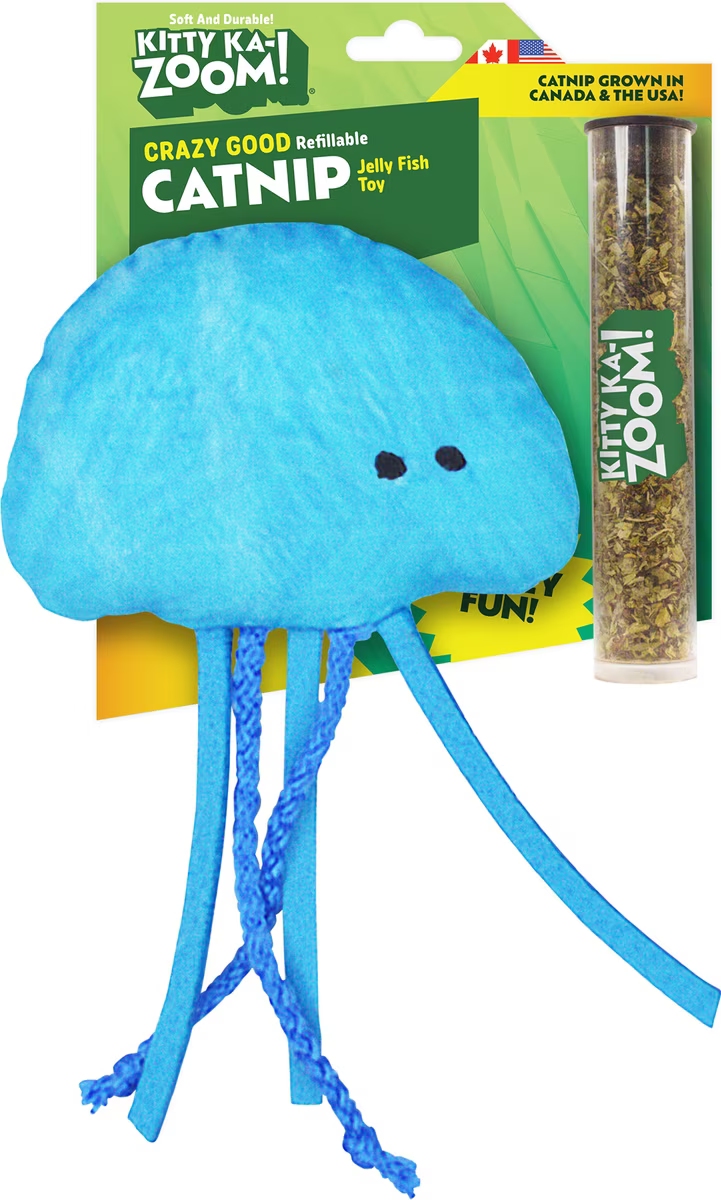 Get ready for some zoomie fun with Kitty Ka-Zoom’s Jelly Fish Refillable Catnip Cat Toy with Catnip. This durable and entertaining toy comes with premium catnip grown in North America. Its soft plush body, felt extremities, and crinkly noise-making paper will entice your feline friend to wrestle, toss, and chomp. Not only is this toy super fun, but it also promotes an active and happy lifestyle for your cat by encouraging high-energy play sessions. Simply fill the refillable catnip pocket and watch your cat go ka-zoom!