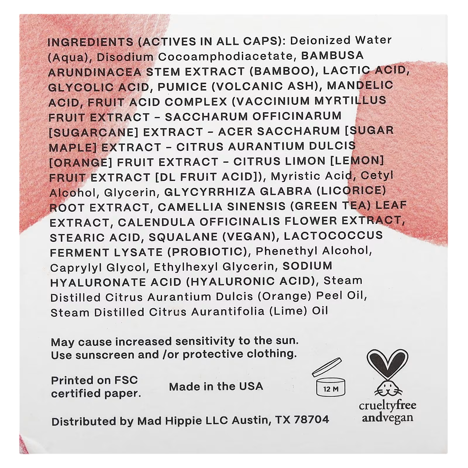 Deionized water (aqua), disodium cocoamphodiacetate, bambusa arundinacea stem extract (bamboo), lactic acid, glycolic acid, pumice (volcanic ash), mandelic acid, fruit acid complex (vaccinium myrtillus fruit extract, saccharum officinarum [sugarcane] extract, acer saccharum [sugar maple] extract, citrus aurantium dulcis [orange] fruit extract, citrus limon [lemon] fruit extract [dl fruit acid]), myristic acid, cetyl alcohol, glycerin, glycyrrhiza glabra (licorice) root extract, camellia sinensis (green tea) leaf extract, calendula officinalis flower extract, stearic acid, squalane (vegan), lactococcus ferment lysate (probiotic), phenethyl alcohol, caprylyl glycol, ethylhexyl glycerin, sodium hyaluronate acid (hyaluronic acid), steam distilled citrus aurantium dulcis (orange) peel oil, steam distilled citrus aurantifolia (lime) oil.