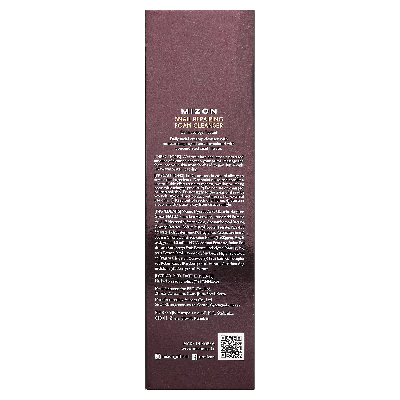 Water, myristic acid, glycerin, butylene glycol, peg-32, potassium hydroxide, lauric acid, palmitic acid, 1,2-hexanediol, stearic acid, cocamidopropyl betaine, glyceryl stearate, sodium methyl cocoyl taurate, peg-100 stearate, polyquaternium-39, fragrance, polyquaternium-7, sodium chloride, snail secretion filtrate(1,500ppm), ethylhexylglycerin, disodium edta, sodium benzoate, rubus fruticosus (blackberry) fruit extract, hydrolyzed extensin, propolis extract, ethyl hexanediol, sambucus nigra fruit extract, fragaria chiloensis (strawberry) fruit extract, tocopherol, rubus idaeus (raspberry) fruit extract, vaccinium angustifolium (blueberry) fruit extract.
