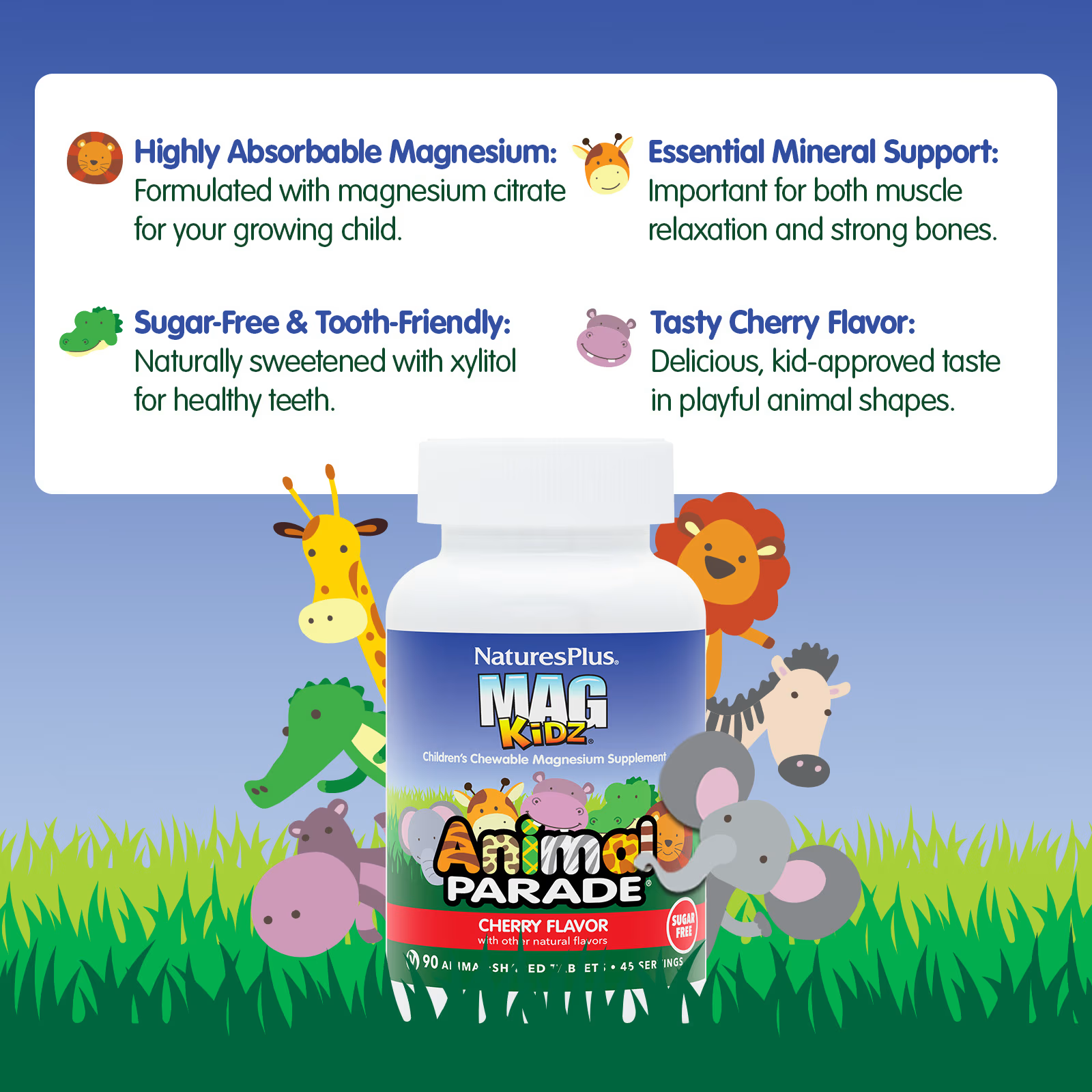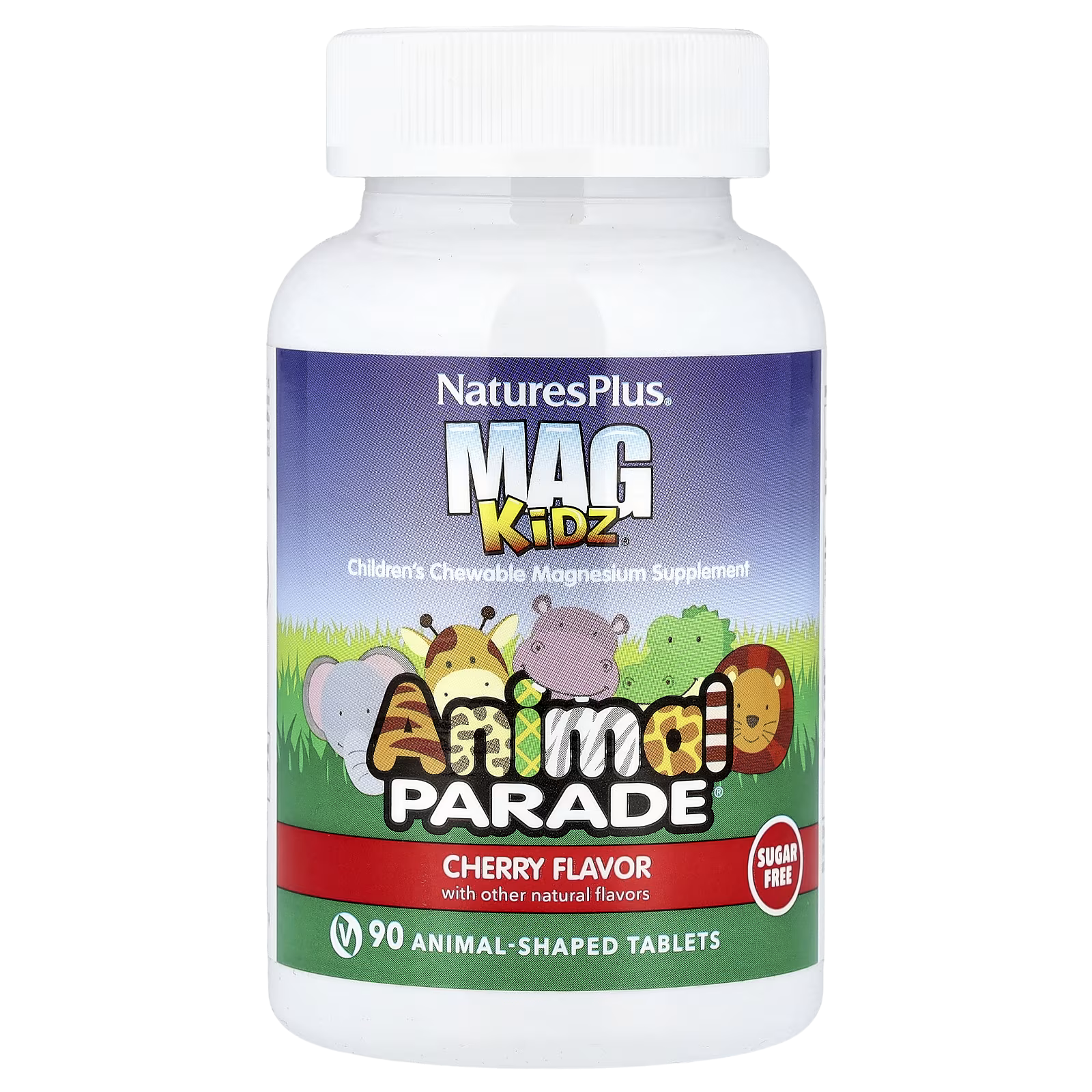 NaturesPlus, MagKidz®, Animal Parade®, Children’s Chewable Magnesium, Cherry, 90 Animal-Shaped Tablets (50 mg per Tablet)