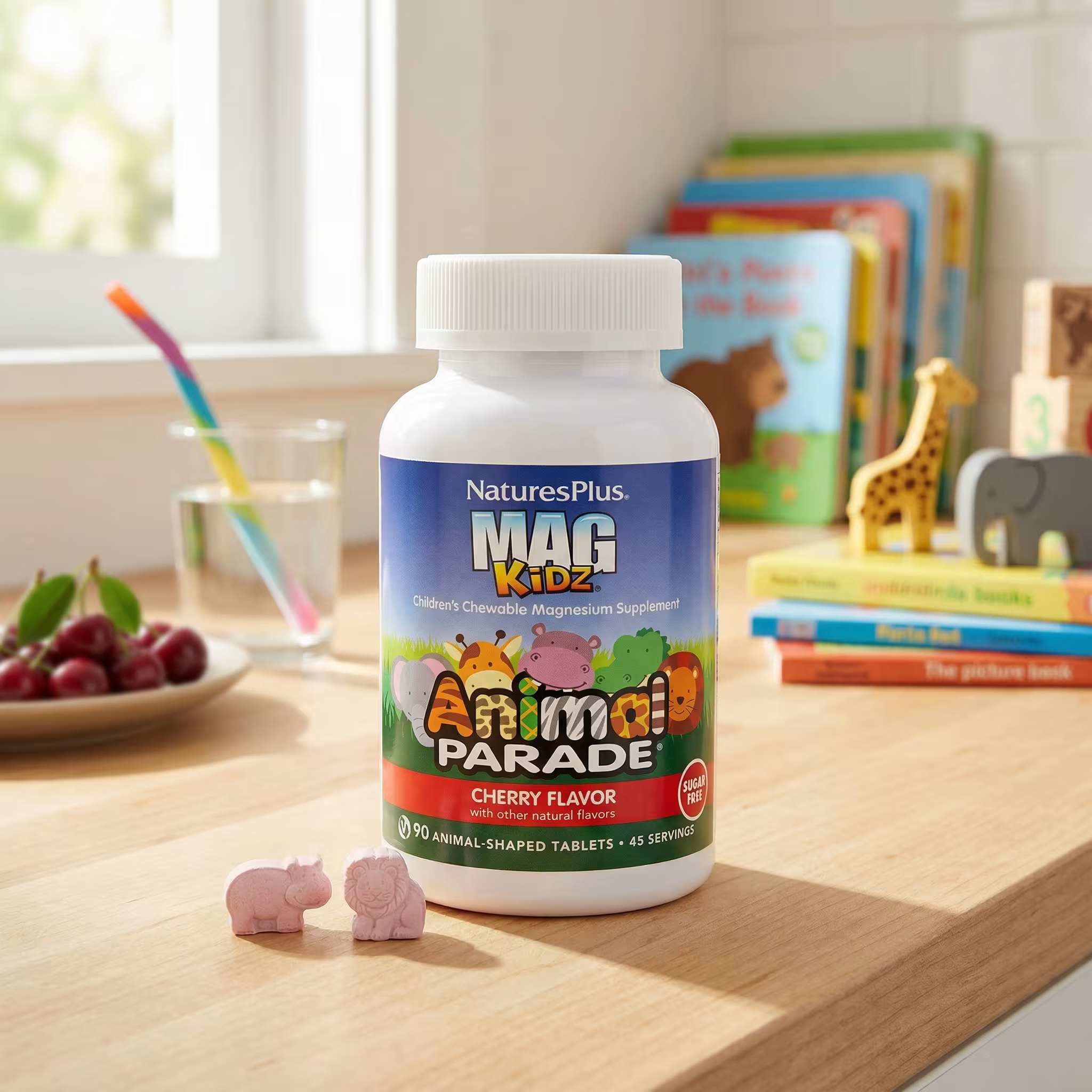 One of the most important minerals for overall kidz’ health is Magnesium, and many kidz just aren’t getting enough. Experience the delicious nutritional power of Animal Parade® MagKidz. Chewable, delivering 100 mg of magnesium in the highly bioavailable and preferred form as Magnesium Citrate! Kidz will love the delicious Sugar Free cherry flavor and the fun animal shapes.