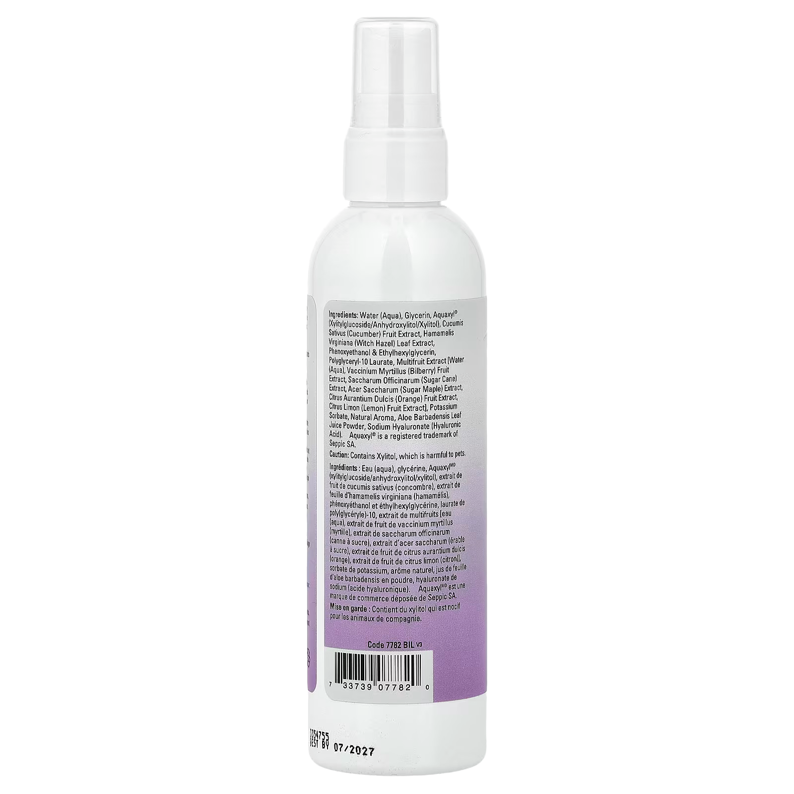 Water, glycerin, aquaxyl® (xylitylglucoside/anhydroxylitol/xylitol), cucumis sativus (cucumber) fruit extract, hamamelis virginiana (witch hazel) leaf extract, phenoxyethanol & ethylhexylglycerin, polyglyceryl-10 laurate, multifruit extract [water, vaccinium myrtillus (bilberry) fruit extract, saccharum officinarum (sugar cane) extract, acer saccharum (sugar maple) extract, citrus aurantium dulcis (orange) fruit extract, citrus limon (lemon) fruit extract], potassium sorbate, natural aroma, aloe barbadensis leaf juice powder, sodium hyaluronate (hyaluronic acid).