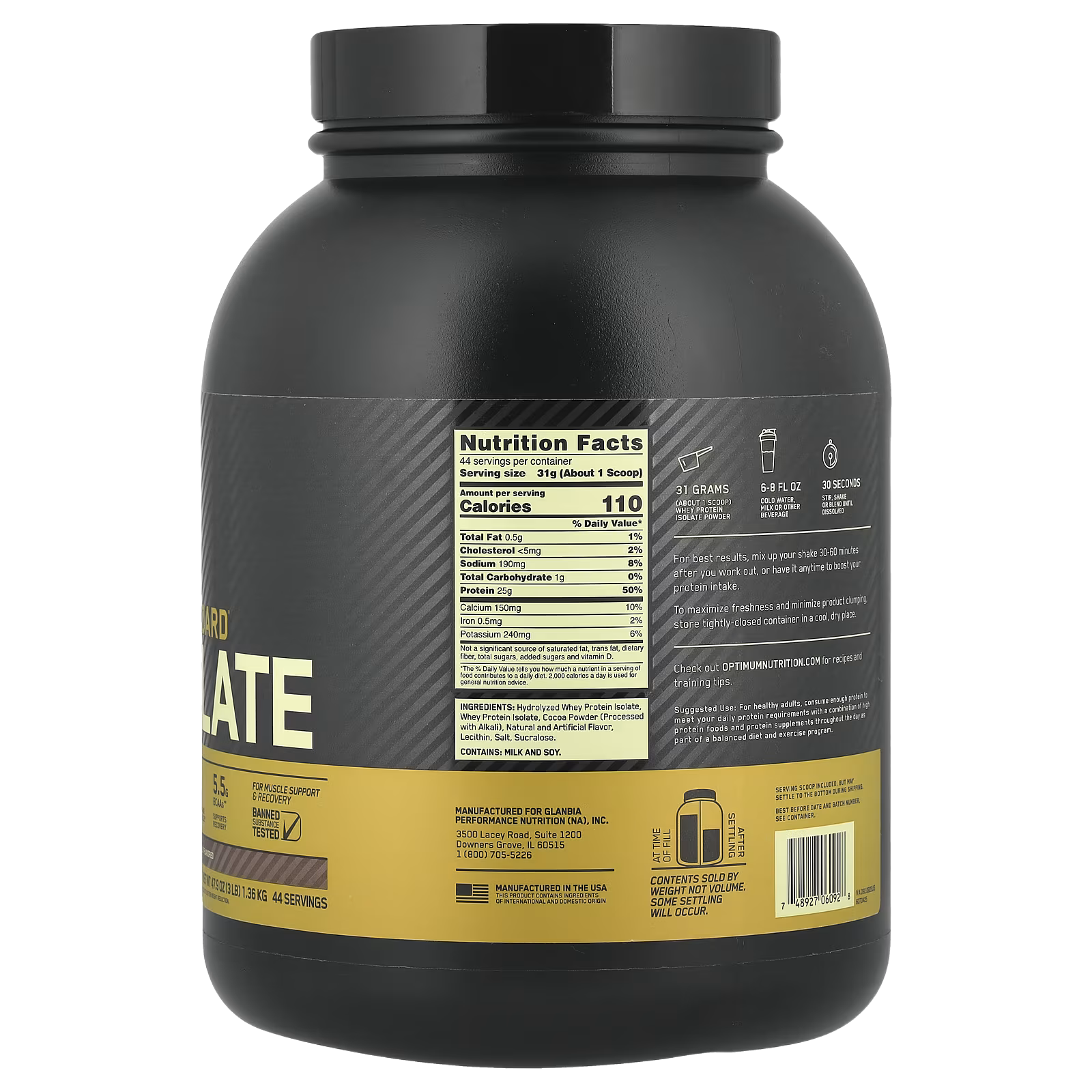 Using a series of sophisticated separation processes, excess fat, cholesterol, sugars, and other materials are removed so that 0.5 grams of total fat and 1 gram of carbohydrates remain in each serving of GOLD STANDARD 100% ISOLATE™.