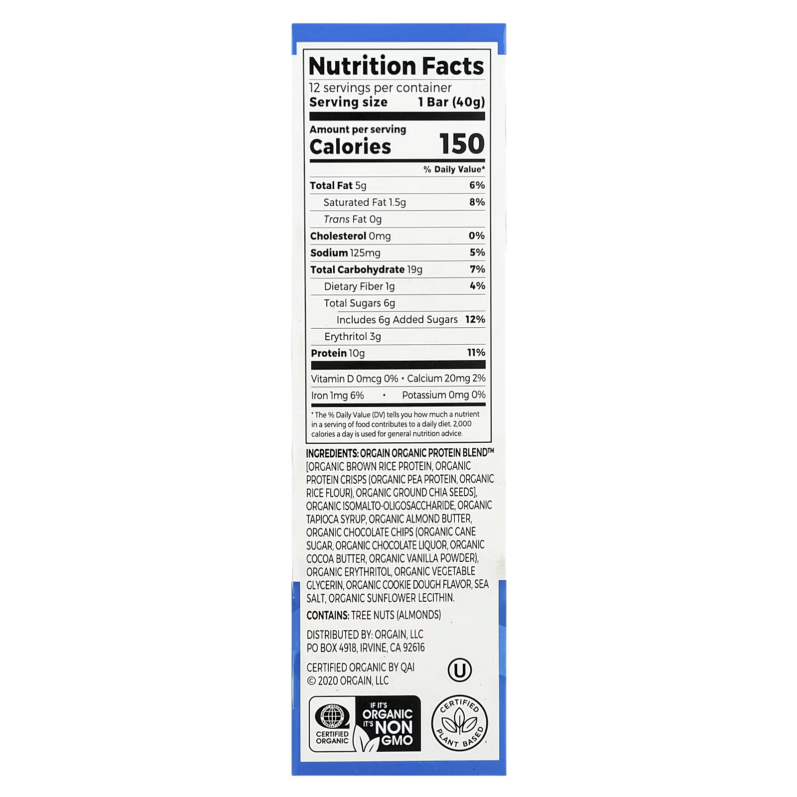 Orgain organic protein blend™ [organic brown rice protein, organic protein crisps (organic pea protein, organic rice flour), organic ground chia seeds], organic isomalto-oligosaccharide, organic tapioca syrup, organic almond butter, organic chocolate chips (organic cane sugar, organic chocolate liquor, organic cocoa butter, organic vanilla powder), organic erythritol, organic vegetable glycerin, organic cookie dough flavor, sea salt, organic sunflower lecithin.