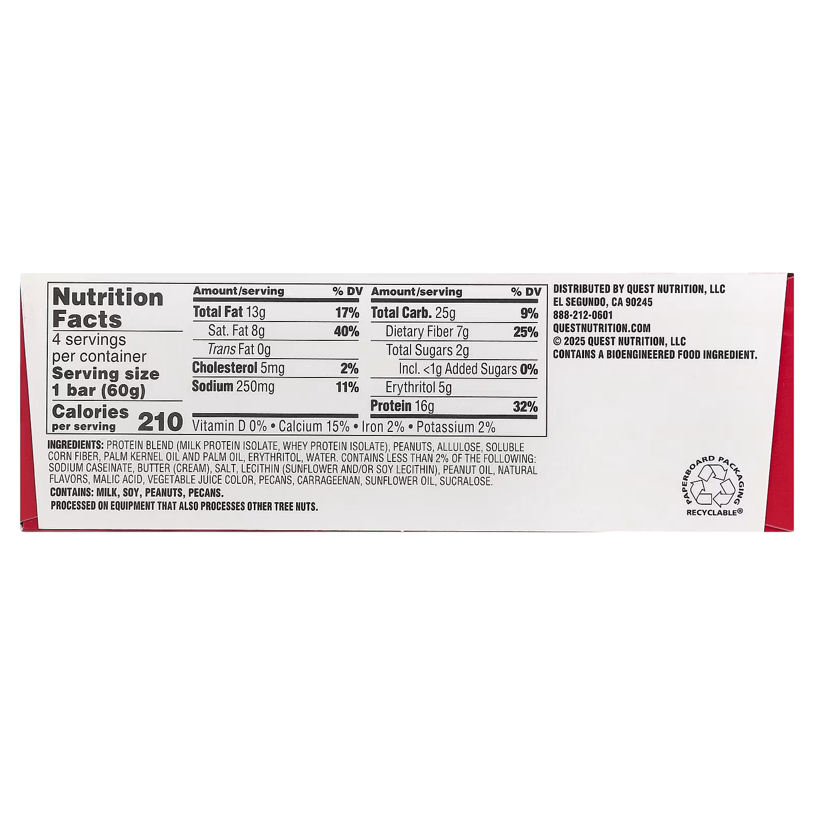 Protein blend (milk protein isolate, whey protein isolate), peanuts, allulose, soluble corn fiber, palm kernel oil and palm oil, erythritol, water. Contains less than 2% of the following: sodium caseinate, butter (cream), salt, lecithin (sunflower and/or soy lecithin), peanut oil, natural flavors, malic acid, vegetable juice color, pecans, carrageenan, sunflower oil, sucralose.