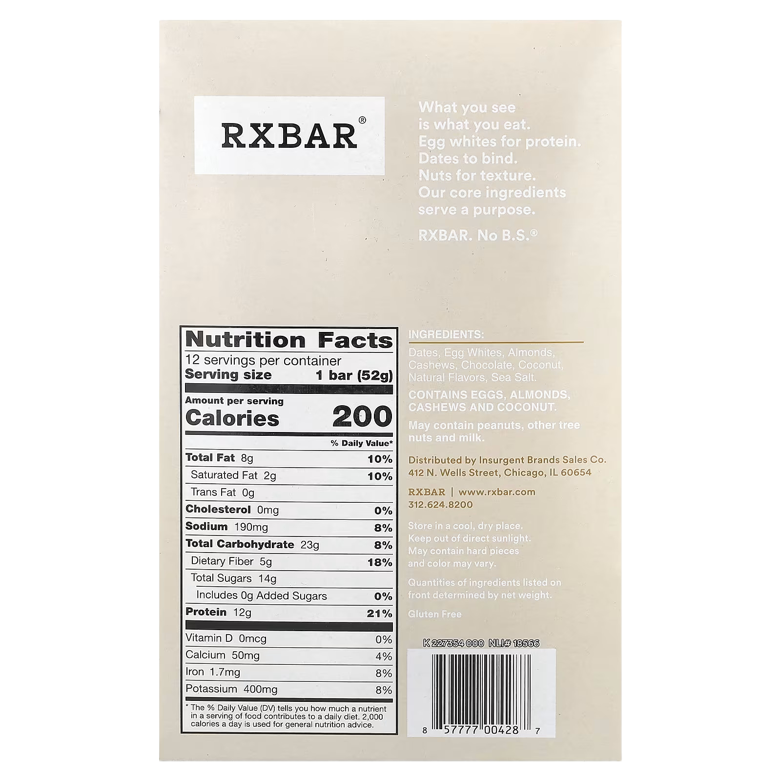 RXBAR, Protein Bar, Coconut Chocolate, 12 Bars, 1.8 oz (52 g) Each
