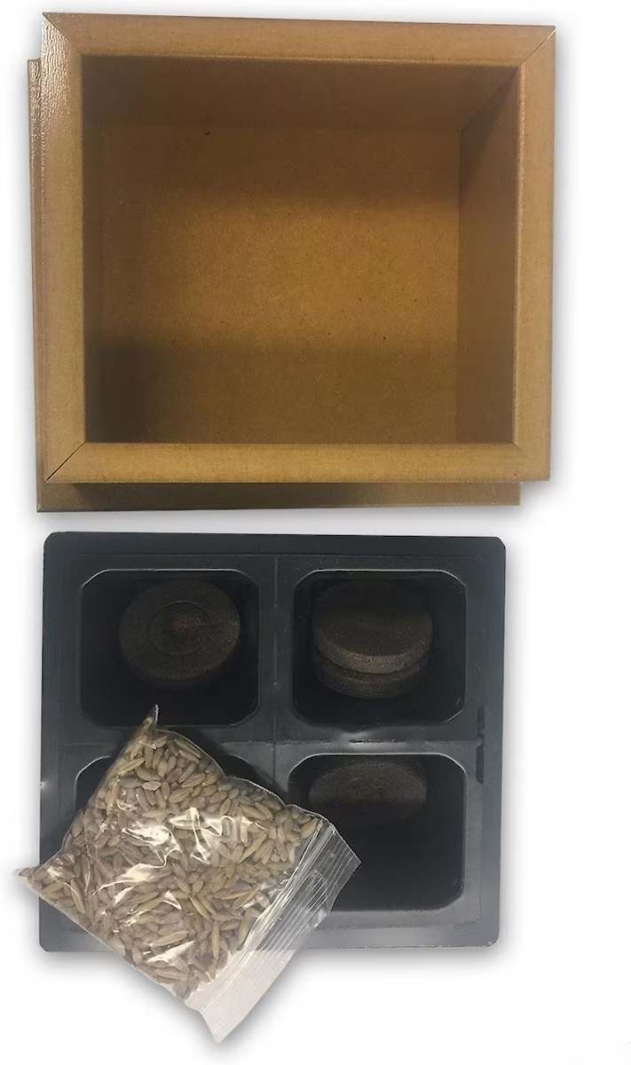 The decorative wood box is filled with oats, rye, wheat, and barley and they only take 4-6 days to grow