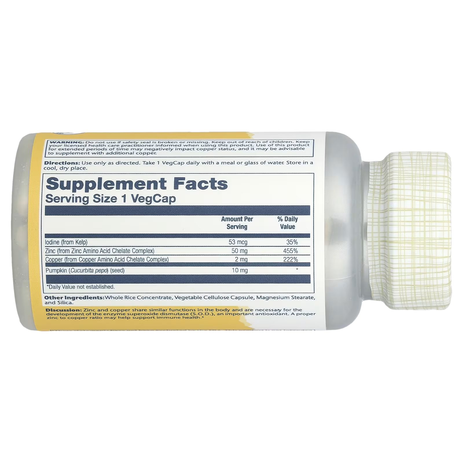 Do not use if safety seal is broken or missing. Keep out of reach of children. Keep your licensed health care practitioner informed when using this product. Use of this product for extended periods of time may negatively impact copper status, and it may be advisable to supplement with additional copper.