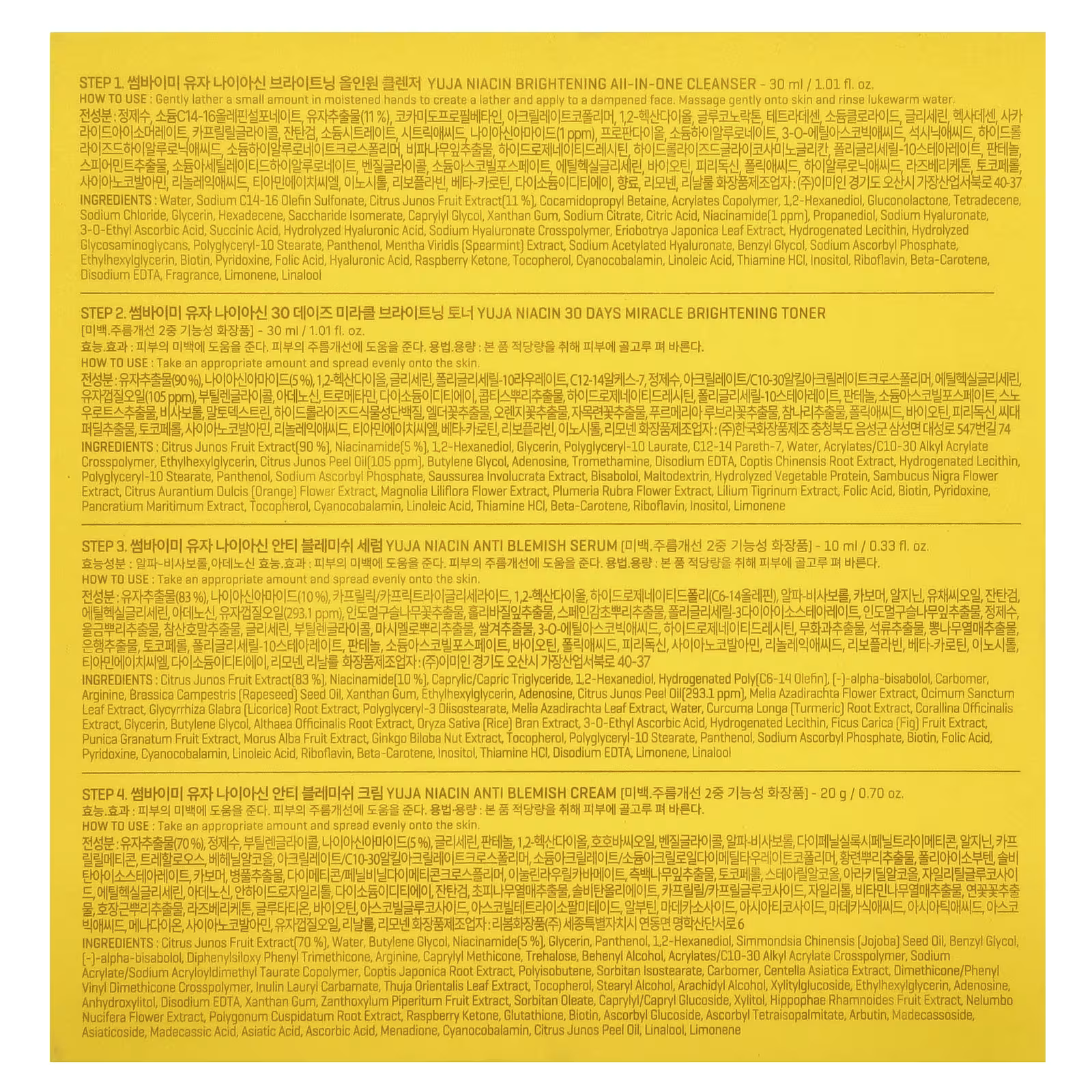 Yuja Niacin, Anti Blemish Cream: Citrus junos fruit extract(70 %], water, butylene glycol, niacinamide(5 %), glycerin, panthenol, 1,2-hexanediol, simmondsia chinensis (jojoba) seed oil, benzyl glycol, [-]-alpha-bisabolol, diphenylsiloxy phenyl trimethicone, arginine, caprylyl methicone, trehalose, behenyl alcohol, acrylates/c10-30 alkyl acrylate crosspolymer, sodium acrylate/sodium acryloyldimethyl taurate copolymer, coptis japonica root extract, polyisobutene, sorbitan isostearate, carbomer, centella asiatica extract, dimethicone/phenyl vinyl dimethicone crosspolymer, inulin lauryl carbamate, thuja orientalis leaf extract, tocopherol, stearyl alcohol, arachidyl alcohol, xylitylglucoside, ethylhexylglycerin, adenosine, anhydroxylitol, disodium edta, xanthan gum, zanthoxylum piperitum fruit extract, sorbitan oleate, caprylyl/capryl glucoside, xylitol, hippophae rhamnoides fruit extract, nelumbo nucifera flower extract, polygonum cuspidatum root extract, raspberry ketone, glutathione, biotin, ascorbyl glucoside, ascorbyl tetraisopalmitate, arbutin, madecassoside, asiaticoside, madecassic acid, asiatic acid, ascorbic acid, menadione, cyanocobalamin, citrus junos peel oil, linalool, limonene.