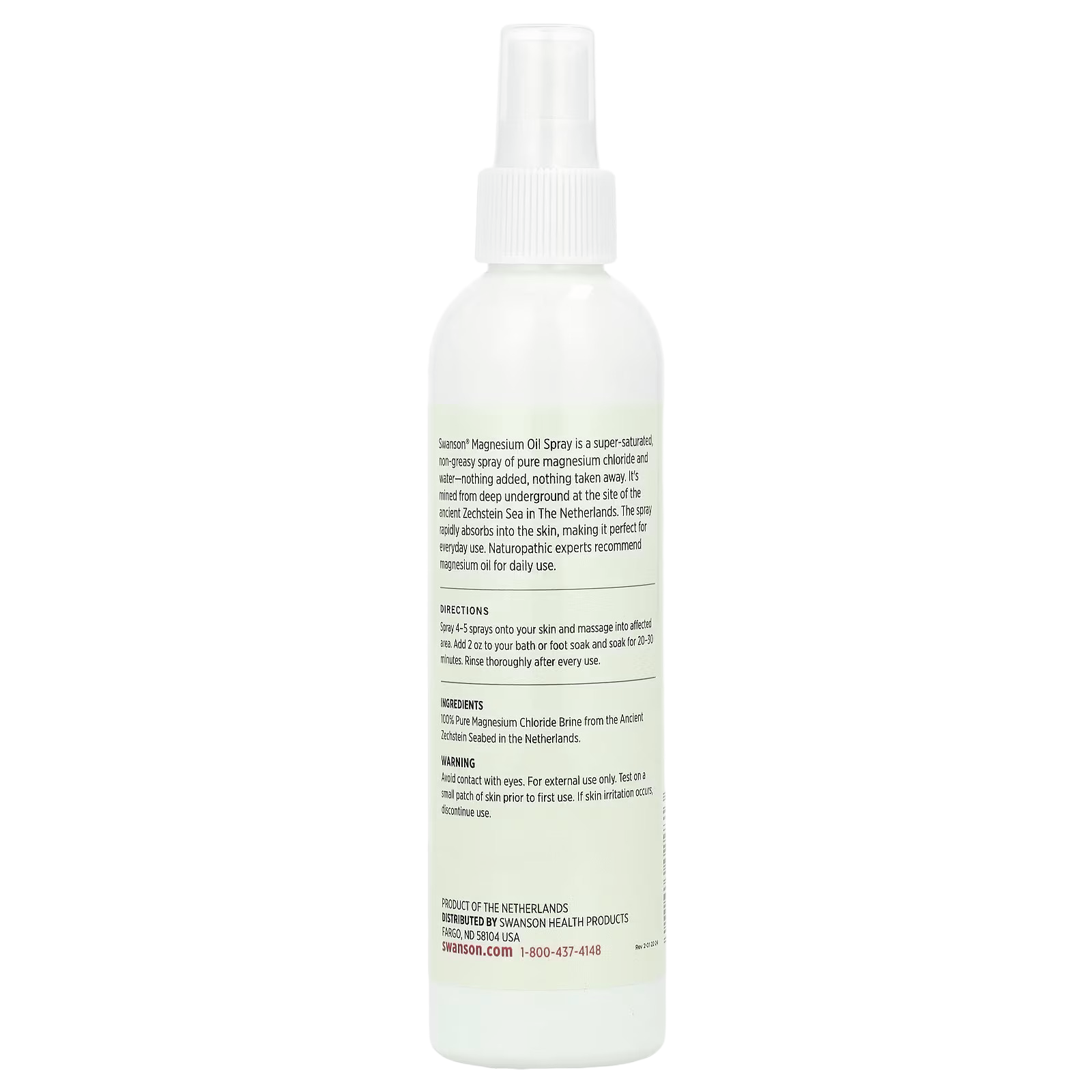 Swanson® Magnesium Oil Spray is a super-saturated, non-greasy spray of pure magnesium chloride and water–nothing added, nothing taken away. It’s mined from deep underground at the site of the ancient Zechstein Sea in The Netherlands. The spray rapidly absorbs into the skin, making it perfect for everyday use. Naturopathic experts recommend magnesium oil for daily use.