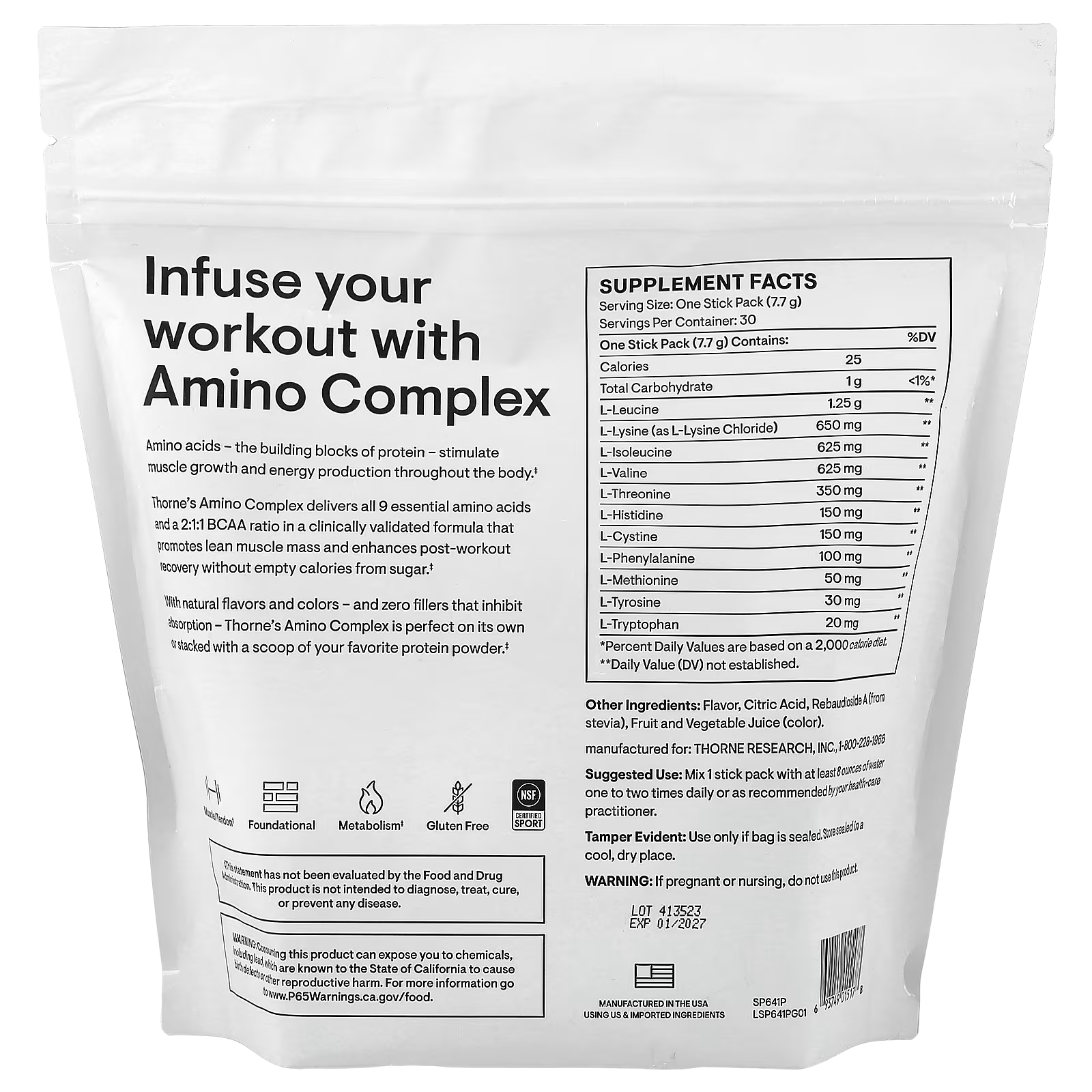 Thorne’s Amino Complex delivers all 9 essential amino acids and a 2:1:1 BCAA ratio in a clinically validated formula that promotes lean muscle mass and enhances post-workout recovery without empty calories from sugar.