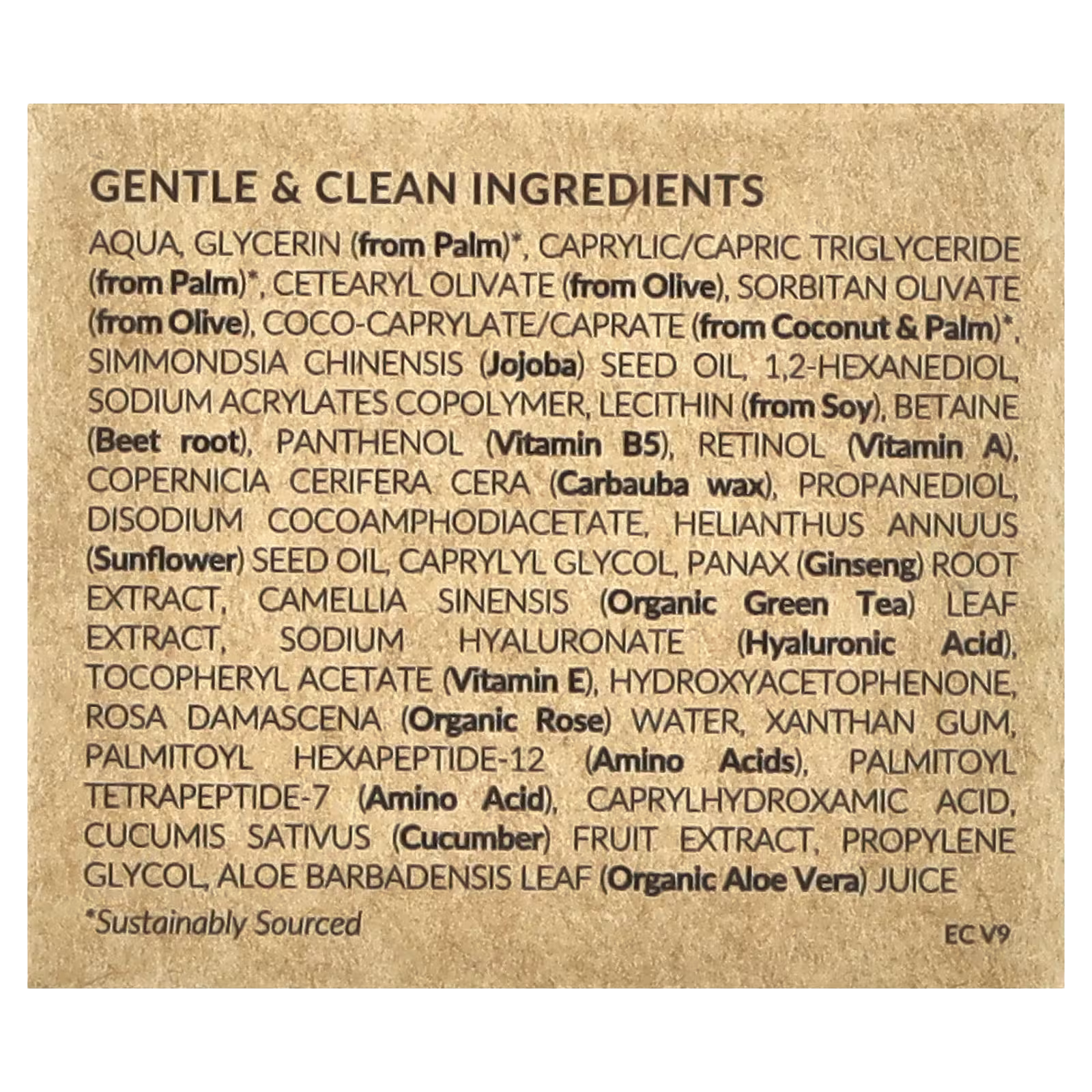 Aqua, glycerin (from palm) *, caprylic/capric triglyceride (from palm) *, cetearyl olivate (from olive), sorbitan olivate (from olive), coco-caprylate/caprate (from coconut & palm) simmondsia chinensis (jojoba) seed oil, 1,2-hexanediol sodium acrylates copolymer, lecithin (from soy), betaine beet root), panthenol (vitamin b5), retinol (vitamin a) copernicia cerifera cera (carbauba wax), propanediol, disodium cocoamphodiacetate, helianthus annuus (sunflower) seed oil, caprylyl glycol, panax (ginseng) root extract camellia sinensis (organic green tea) leaf extract sodium hyaluronate (hyaluronic acid) tocopheryl acetate (vitamin e), hydroxyacetophenone, rosa damascena (organic rose) water, xanthan gum palmitoyl hexapeptide-12 (amino acids), palmitoyl tetrapeptide-7 (amino acid), caprylhydroxamic acid cucumis sativus (cucumber) fruit extract, propylene glycol, aloe barbadensis leaf (organic aloe vera) juice.