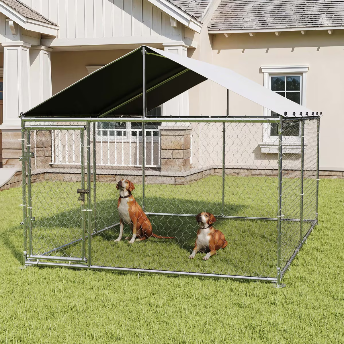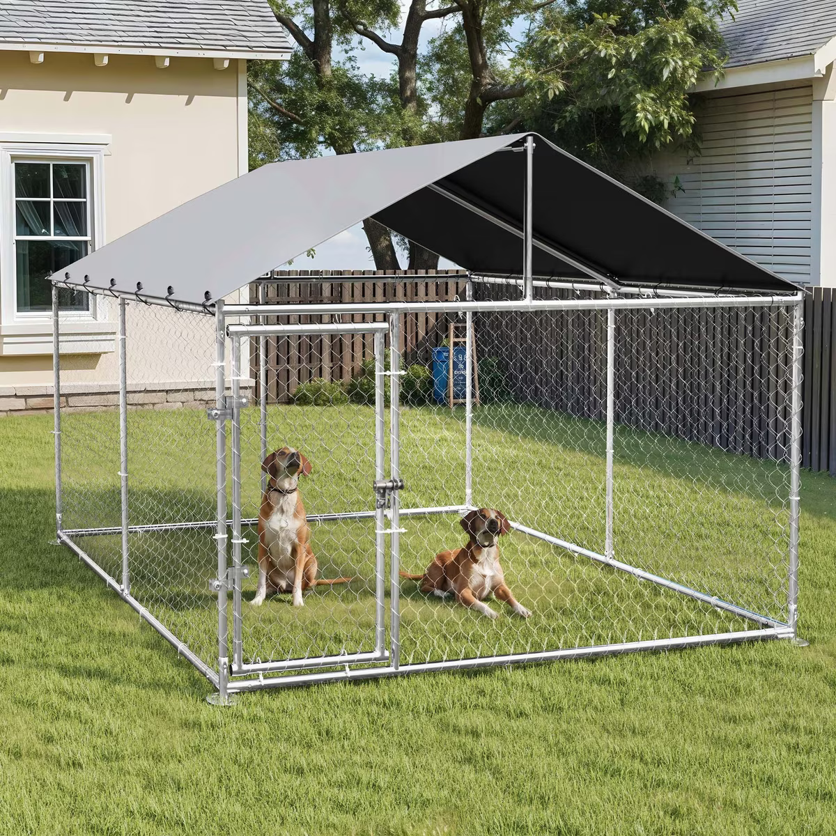The Wooflex Heavy Duty Outdoor Dog Kennel with Roof & Metal Gate is an outdoor sanctuary for your furbaby. This heavy-duty dog kennel is designed to offer a secure and enclosed space for your pup to enjoy the great outdoors. A lockable gate gives you convenient access to your furry friend, while the galvanized steel tubing is super strong for reliable use. A waterproof, UV-blocking roof helps protect your best friend from extreme weather. Plus, the kennel is designed for a straightforward assembly.