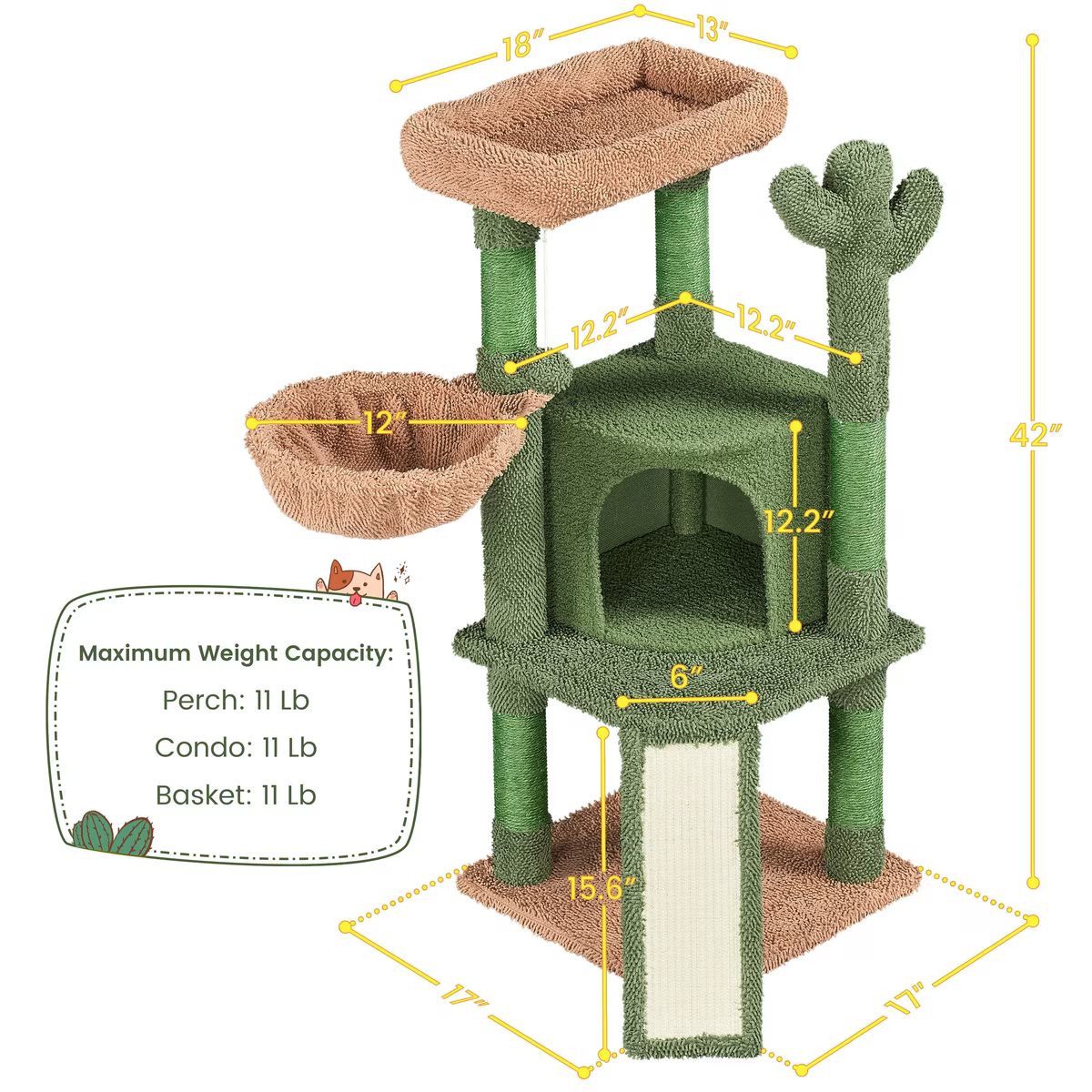 Give your prickly puss a healthy outlet for scratching with the Yaheetech Cactus 42-in Plush Cat Tree! This 42-inch cat tree sports a vibrant color combo with cactus-shaped details for a fun Southwestern look. Furnished with a cozy top platform with padded foam, a warm condo, a comfy basket and five scratching posts at different heights, this cactus cat tree is the purr-fect solution for cats to rest or sharpen their claws. This kitten tree provides a vertical territory for your cats to climb, play, scratch, establish authority or hide. It’s steady enough for cats to jump on and off yet cozy enough for them to perch and nap.