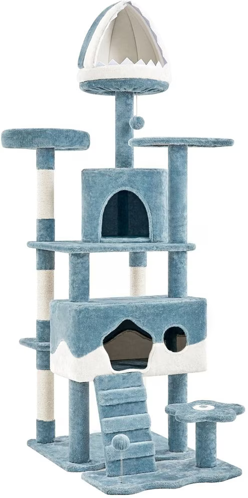 This cat tower has an ocean-inspired design with a shark’s mouth-style igloo perch, fish-shaped scratcher, and wavy-edged boards.