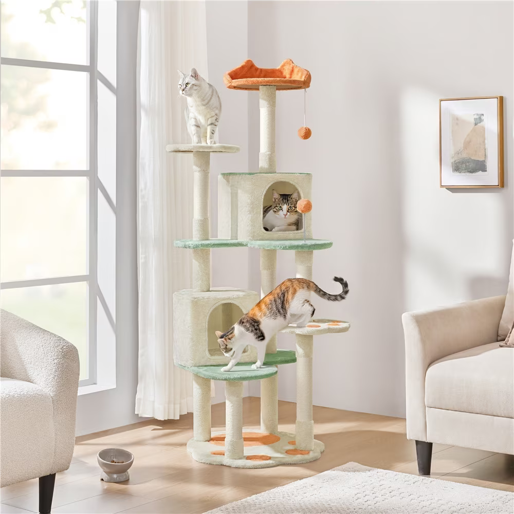Features a reinforced cat paw-shaped base, multiple scratching posts, 2 cozy upper deck viewing perches, 2 condos for hiding, and 3 extended platforms for lounging.