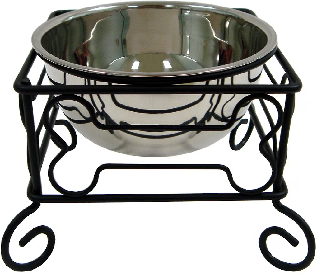 Elegant elevated feeder features a wrought-iron stand with a cute bone design and scrolled legs.