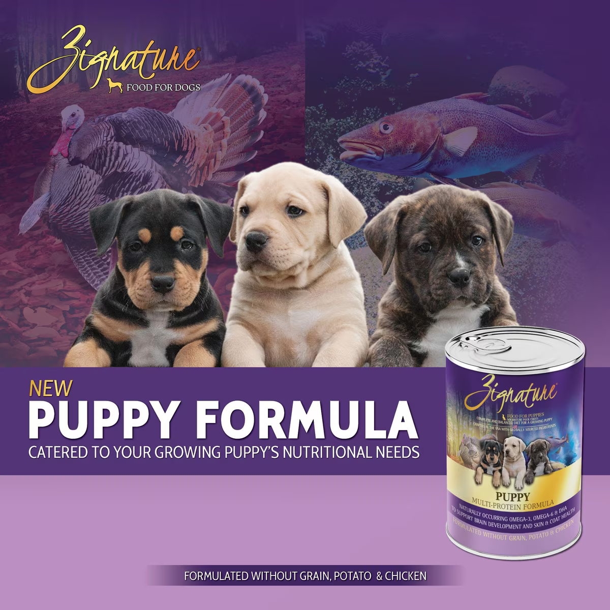 Get ready to be the leader of the pack in puppy nutrition with Zignature Puppy Formula Pate Canned Wet Dog Food. This carefully crafted recipe is designed to meet all the nutritional needs of your growing puppy. As your loyal canine companion embarks on his journey of growth, trust in a brand that grows alongside him, providing him with the best fuel for every new adventure. Made with premium proteins like turkey and whitefish and enriched with added probiotics to support digestive health. For pet parents who want the best for their puppies, Zignature’s Puppy Formula is the perfect solution. It is packed with essential vitamins and minerals that support brain development, a healthy immune system, and a shiny coat. Manufactured with care in the USA by a family-owned business, this nutrient-rich blend offers a wholesome start for your puppy’s lifelong health journey.